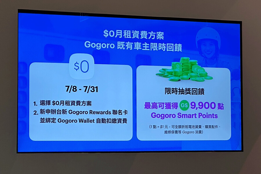 - Gogoro 既有車主優惠:即日起至 7/31,新申辦台新 Gogoro Rewards 聯名卡,選用「$0月租」資費方案,綁定 Gogoro Wallet 並設定自動扣繳資費,享最高 10% Gogoro Smart Points 點數回饋;完成指定任務,再有機會獲得最高 9,900 點 Gogoro Smart Points 回饋。