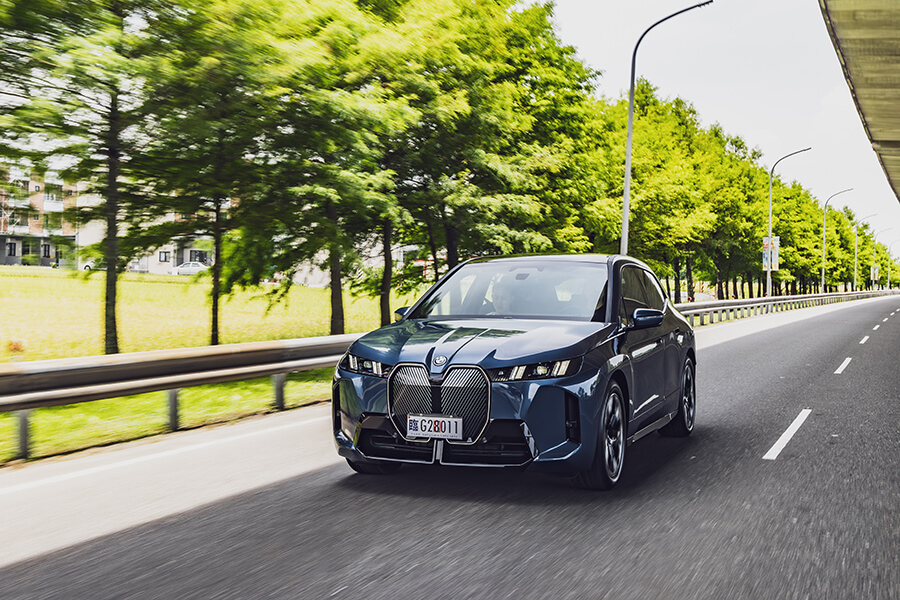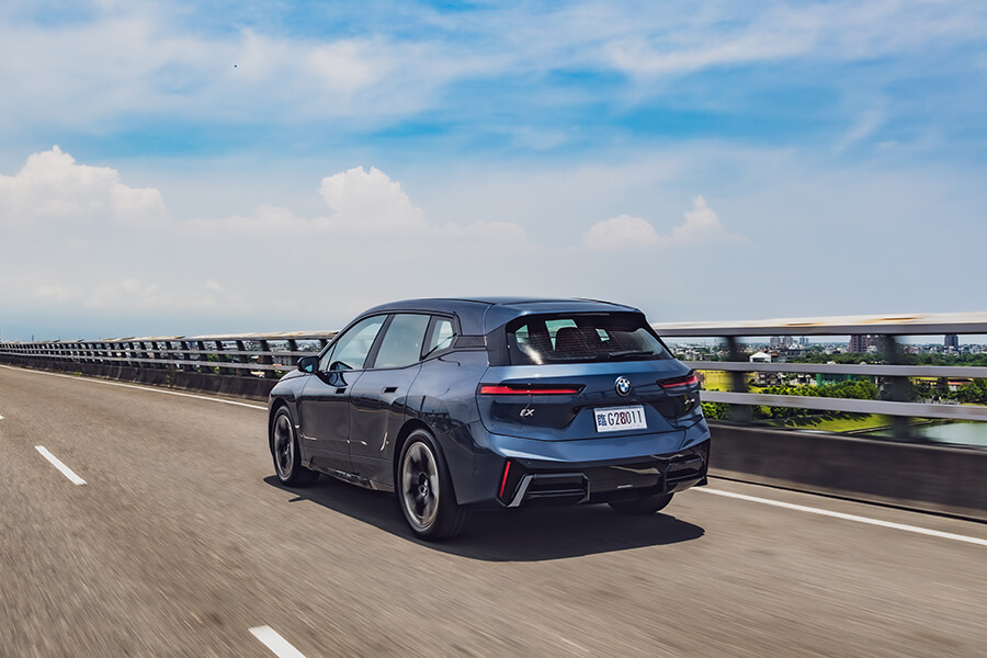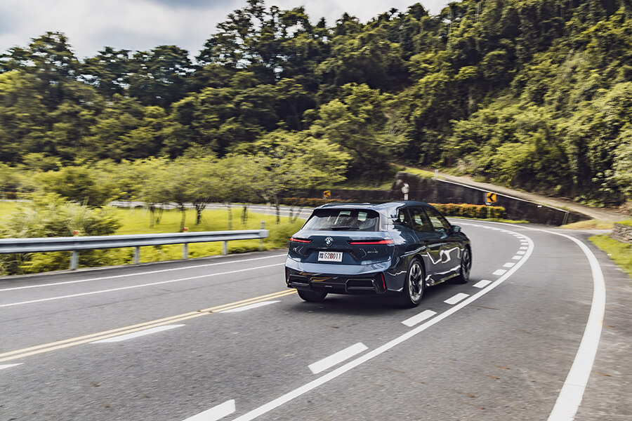 兩張漂浮在控台上方的曲面螢幕裡運作著OS8.5系統,50米倒車輔助、第三方app乃至於結合電量控管與充電行程規劃的導航系統……在功能性、畫面精緻度都沒啥好挑剔,多種駕駛模式亦同樣採取隨心情而改變燈光、音效與加速、滑行等表現,氛圍的確是好;而如果你也是在乎車輛當前狀態多過於自身感官的駕駛,亦能自行設定模式與內部細項,更能將車輛狀態了然於心。這輛電動車的方向盤在開上路後轉起來卻是勁道十足,毫無多數電車懷抱那種顯著的輕不溜丟電子氣息。而在這一個開闊舒服的車艙裡,儘管如今要到xDrive60才有標配自動水平氣壓懸吊,這組避震熨平路面滋擾的功力同樣高明,不僅處理路面碎震反應如同磁浮列車一般船過水無痕,面對路面補丁、人孔蓋等落差顛簸會透過俐落乾脆的做動聲響盡一份告知義務,傳遞到座椅與對車身姿態的震動與影響卻微乎其微,試車途中一度穿越表面破碎且遍佈坑洞的水泥路面,原以為這下可要變成1:1搖頭公仔左搖右晃,這車的避震設定之舒適卻有大震化小、小震化無的本事,僅使我與阿加隨著底盤姿態變換兩三下角度,便重新恢復四平八穩。右腳一踩,5.1秒的零百加速反應輕快中略帶狠勁;行至高速階段的加速力道略有放緩,但顯然面對一般道路的超車需求已是大有餘裕,況且儘管換上了這一身更具侵略性的運動服,但應該沒有人會想以這部生活氣氛滿點的電動SUV拿去山上試招吧?