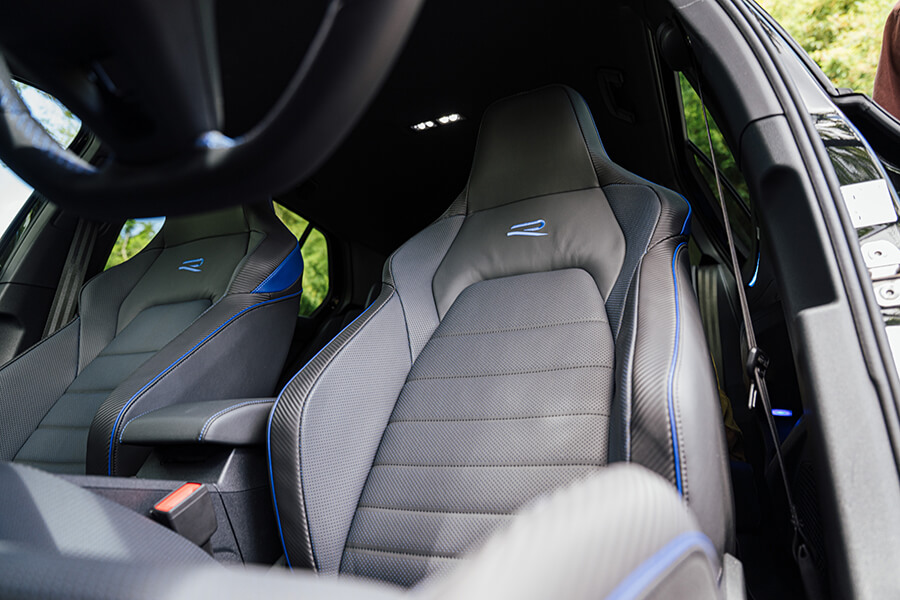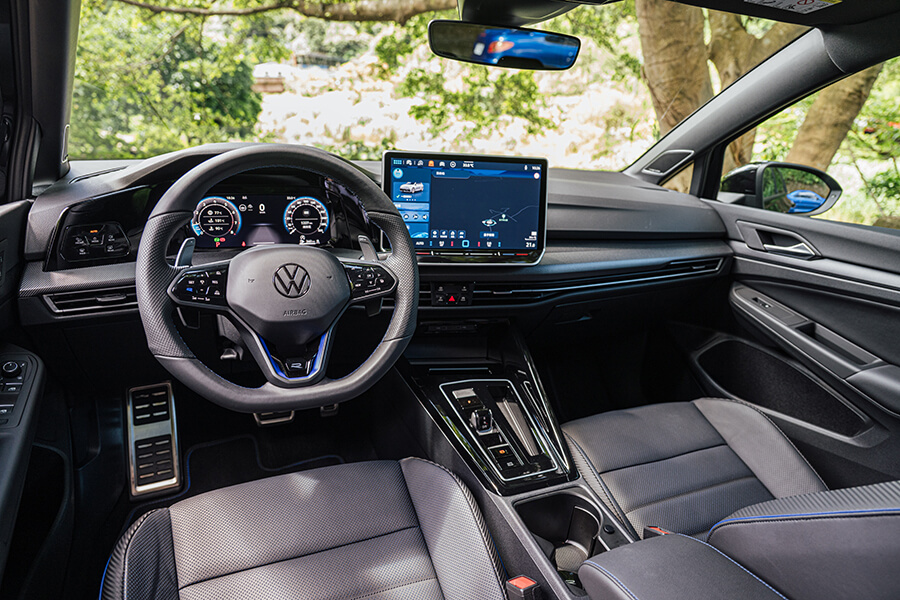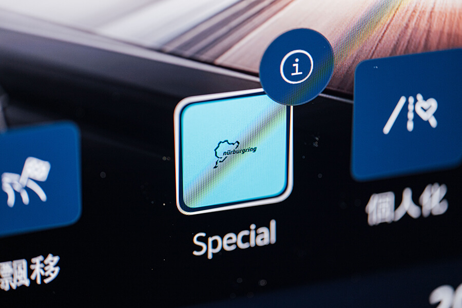 比起外觀,車內相對就顯得五光十色吶。坐在帶有藍色滾邊的Nappa跑車座椅上,面前是可顯示G值、渦輪壓力、四輪即時扭力分配等資訊的10.25吋數位儀表,車內12.9吋儀表裡同樣是那組使用快捷、條理分明的資訊娛樂系統,除了有智慧語音助理、帶有駛出功能的停車輔助隨侍在側,最受矚目的還是可藉由螢幕快速鍵、或是方向盤上的R字按鈕快速召喚的駕駛模式介面。由於此車具備R Performance Package,賽車模式點進去後還會出現Drift、Special兩個選項,而Special模式按鈕上的熟悉圖樣直接就告訴你這屬於攻略紐伯靈賽道的專屬特調,同時還帶來直線加速測時、與進一步提升限速至270km/h的Vmax套件。想要車尾那支招搖過市的大尾翼?也在R Performance Package的組合清單之中喔。這些在一般版Golf R上可是需另外選配的武器組合,在該套件列為標配的Black Edition上,便直接呈現Golf R最終完全體的姿態。猶記得兩三年前在麗寶的賽道活動上將R Performance家族上上下下把玩了一遍,卻獨漏心中最屬意的Golf R,在願望延遲實現的這天,上回聲聲怨嘆試駕籤運不佳錯過8.5代Golf GTI的Jason也聞香而至,要與這輛性能封頂的Hot Hatch輪番試招……