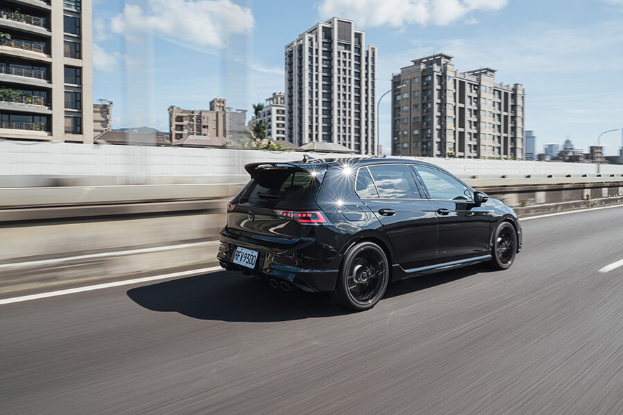 在一個平凡無奇的工作日,攝影Jackal正對著眼前這輛汽車愁眉苦臉——原因並非我們帶來的車太過無趣,事實上此車的有趣之處正是主要罪魁禍首:如您所見,這輛8.5代Golf的一大”亮”點無疑是車前的橫貫日形燈與大太陽下依然清晰可見的發光VW廠徽,再來便是……這個黑漆漆的車身。沒錯,這是一輛Golf R Black Edition,一輛身價207.8萬、同時在僅開放線上訂購一途下亦已清空首波預約名額的稀有貨色,在中午的頂光加上外觀徹頭徹尾的黑化下,通過相機快門簾之後極易化為成像中的一粒黑洞。當然,在Jackal扭盡六壬的妙手回春下,諸位依然得以如同與我輩一同親臨現場一般看清這車猖狂的氣壩開孔、帶有鏤空設計的垂直氣簾、側裙、擴散器,以及尾門上那大幅向後揚起的尾翼。而且就算是這全然的黑,也難以擋住這一身盔裝加身的強烈視覺輪廓。我們還特別注意到腳下這組19吋輕量化輪圈,其輪轂與輻條之纖薄,襯上輪心蓋、圈唇與卡鉗上無所不在的R字樣隱隱散發殺氣,同時喚起你與人行道保持適當淨空距離的警覺意識……。