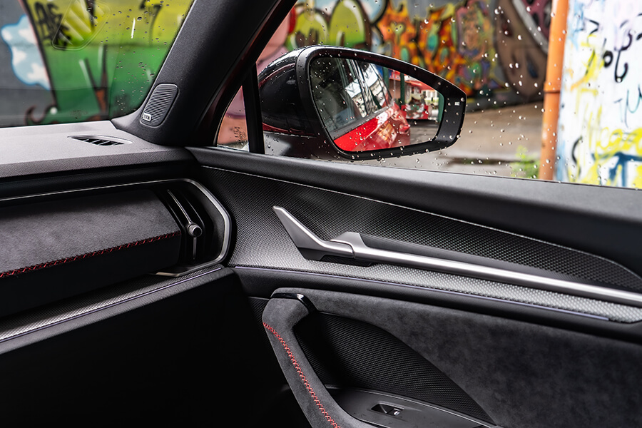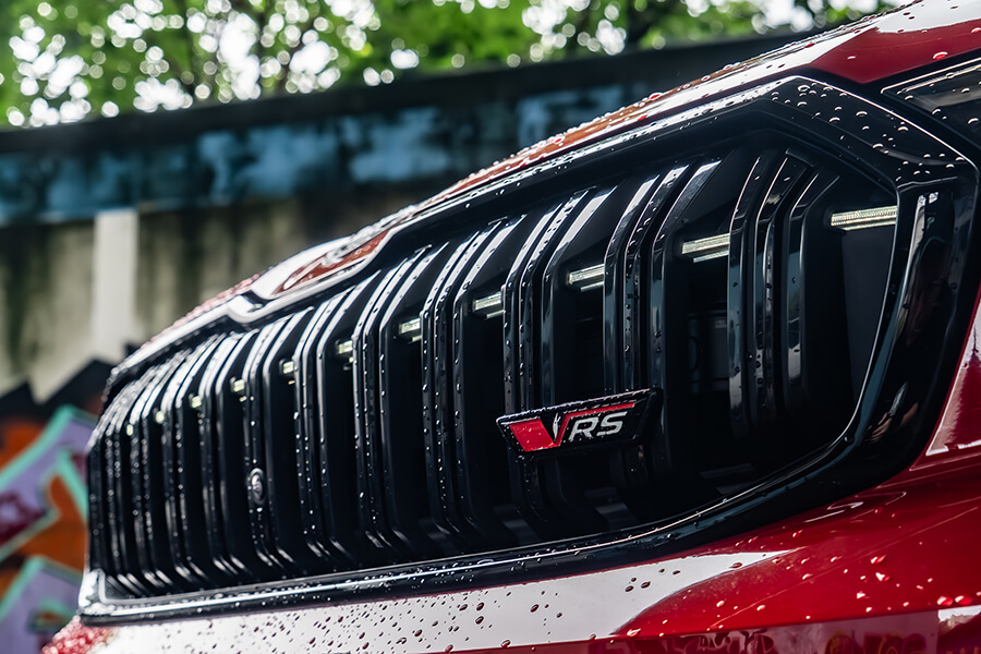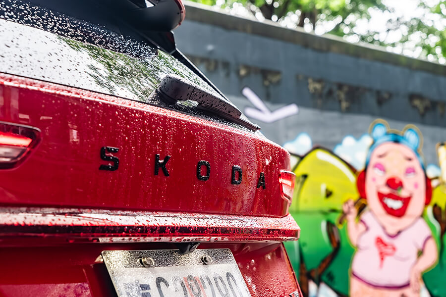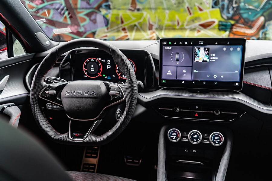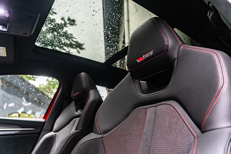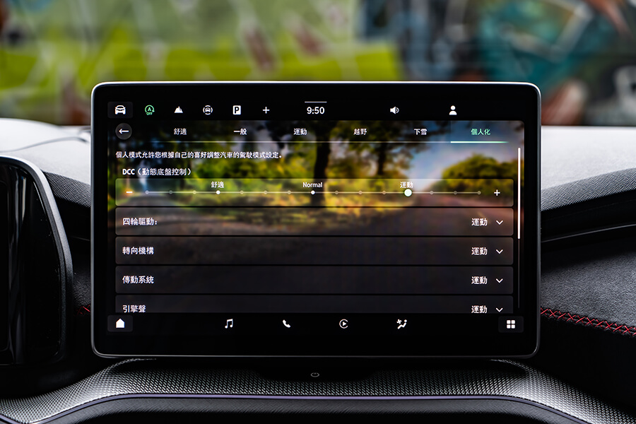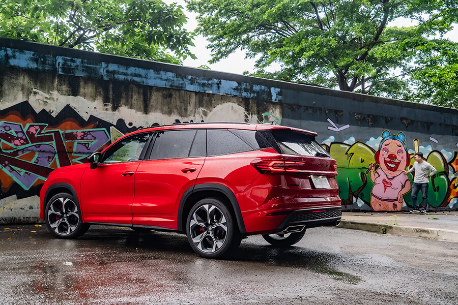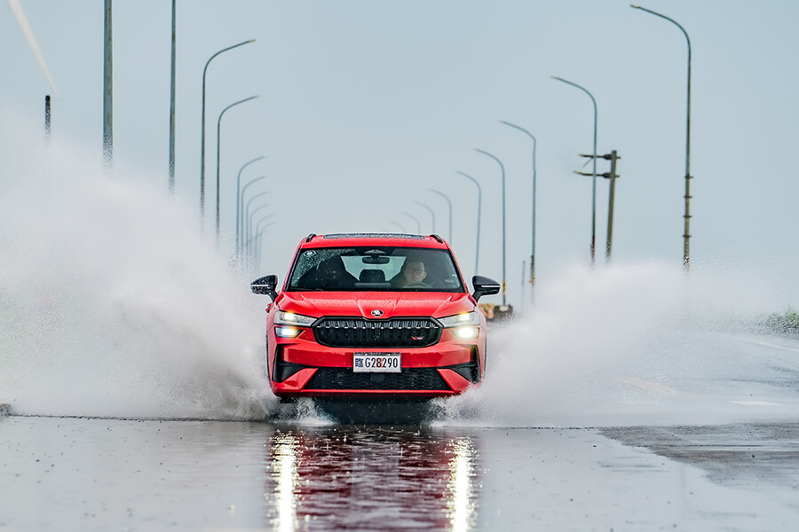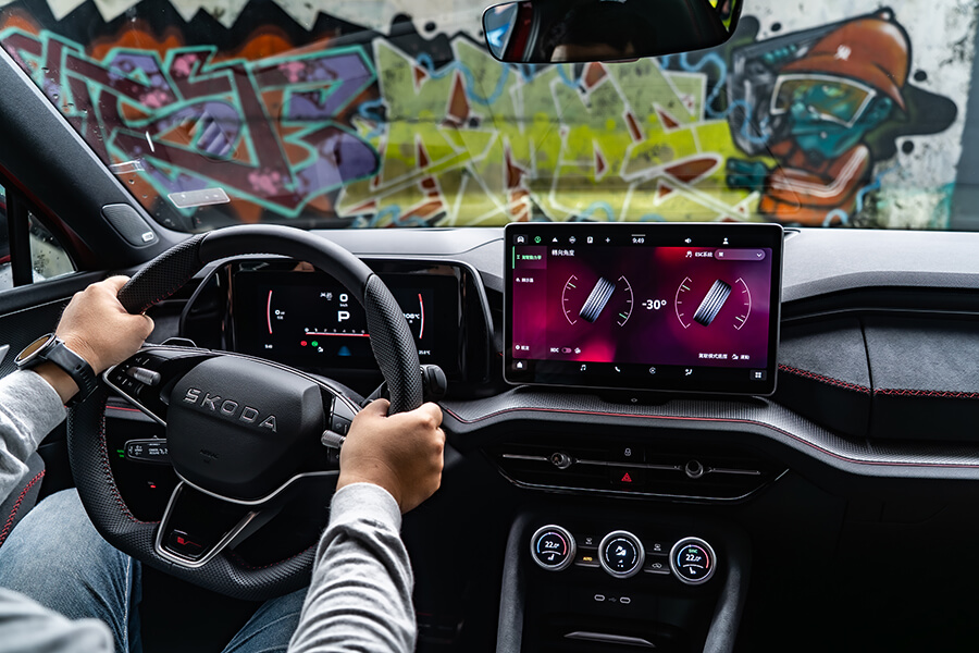 車內光景有別於上回2.0 TSI 4×4車型帶來敞亮愜意的空間感,Kodiaq RS被滿滿麂皮、黑頂棚與銀格紋飾板的車艙維持RS車型一貫的熱血氛圍外,紅色車縫線、10吋儀表上的RS專屬介面,乃至於麂皮/真皮混搭且帶有八向電調、加熱功能的跑車座椅,亦都隨著世代更迭呈現出更加細緻的質感。在這樣的環境之中,腳下那具7速雙離合變速箱在先前體驗2.0 TSI 4×4時就領教過它八面玲瓏的表現,現在有了265匹馬力下,加速發招又更顯得氣力充盈。而即便外頭的雨似乎完全沒有要停下來的意思,這車優異的四驅系統、加上15段可調且壓縮/回彈獨立調整的DCC Plus,讓這部渾身裝滿黑化套件的紅色大傢伙拐起彎來俐落程度有如跳探戈,當腳跟一轉、身驅便順勢到位,車內卻渾然不覺有任何不自然的擺盪,頂多就是在Sport模式之下,對於路面細節有著更清晰的體會……而且掌中的三輻平底運動方向盤竟有著漸進式可變轉向齒比,左打右打,死點分別就是一圈再多一點點,對於在市區環境穿梭挪移可是能起到大作用,無論雙手跟心態都能顯得更加從容。