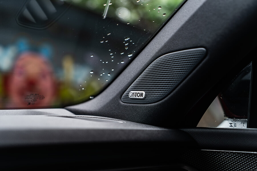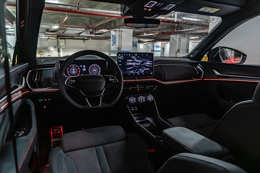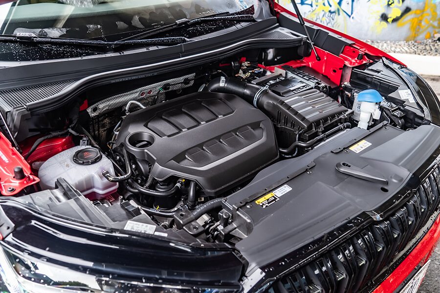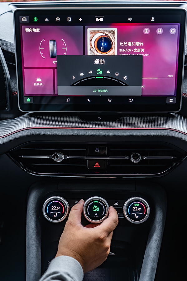 而是的,進入第二代的Kodiaq RS用上EA888 EVO4的2.0 TSI動力,在升級渦輪、高壓噴油嘴、可變汽門正時/揚程,與電子水泵與電控恆溫器雙管齊下的引擎熱能管理,動力來到265匹,零百加速相較前代再砍0.2秒來到6.4秒、極速亦推升至231km/h。帳面上看起來與不久前的Superb 2.0TSI 4×4 Sportplus相當雷同,事實上當一指喚出那多達七種的駕駛模式選項、並調至Sport以上的模式時,自那組優化排氣系統內呼出的音頻顯然雄渾低沉帶有挑釁意味,就連坐在雙層玻璃隔絕外界的車室內都能感覺到。等等,這是怎麼做到的?簡單,Kodiaq RS車內有著CANTON出品、最大功率可達725W的13+1(重低音)揚聲器,在提供樂聲的同時亦能根據車輛採集引擎轉速、汽門角度與渦輪壓力等參數,由車載電腦合成動態聲浪後根據駕駛模式推動揚聲器播放模擬音效,因此諸位不必把管子改到炸街就能在加速時提供助興音效,希望安靜開車?將模擬音效選項一關,車內又再度恢復一片安靜祥和。