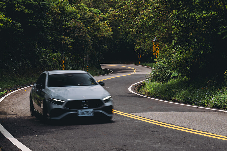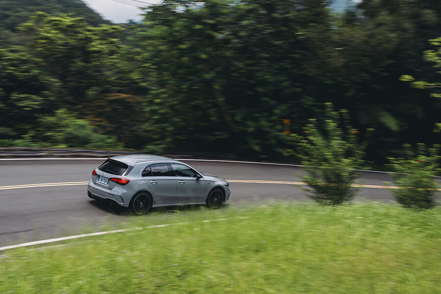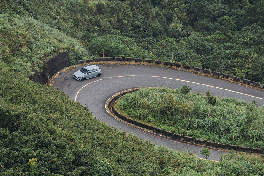 直到來到山腳下之前, A 35 4MATIC 摘星版 都發揮出一輛小型掀背車與生俱來的靈活優勢,那麼上山之後又是如何呢?前方渦輪引擎在起步之後仍需要一段時間讓轉速攀升至扭力輸出峰值。這時轉動方向盤上的圓形旋鈕調整駕駛模式,引擎轉速也跟著一節一節向上拉升;到進入 Sport+ 模式時,引擎轉速與油門反應相當接近已經來到渦輪吁出摧枯拉朽增壓大法的大門口,只消右腳一踩,引擎的嚎叫與40.78公斤米的扭力,就像拎著破門槌石破天驚地奪門而入。此時若你坐在駕駛座上大可不必顯得太過驚惶失措,因為這次 A 35 4MATIC 摘星版 配上的運動化懸吊步法除了第一時間感受到它一流的支撐性,拐頭入彎時車頭指向的敏捷程度、配合上透過麂皮方向盤傳遞至手中,那輕巧卻未失回饋的轉向反應,在8速雙離合快如彈指的換檔反應與動力銜接下,面對彎道遊走的駕駛節奏得以拉升得又快又急;加上19吋輪圈上四條 SportContact 6 配胎在指向性、黏勁方面的出色表現助攻,面對彎前最後一刻的大腳煞車亦能穩住陣腳,做出感性上熱血激情、操作上理性精準的殺彎姿態,確實能讓我在山道攻掠的過程間咧開嘴角、頷首說聲:「有料!」