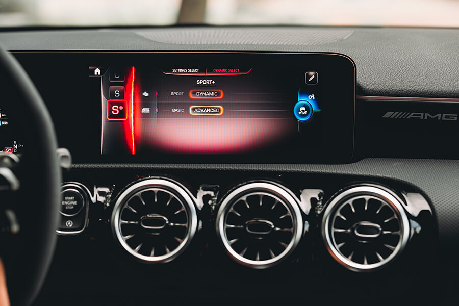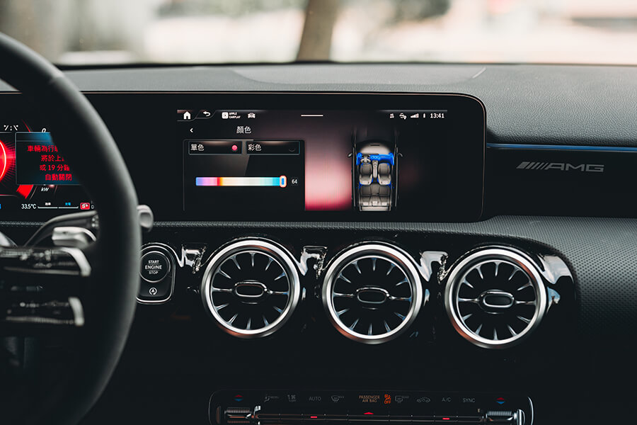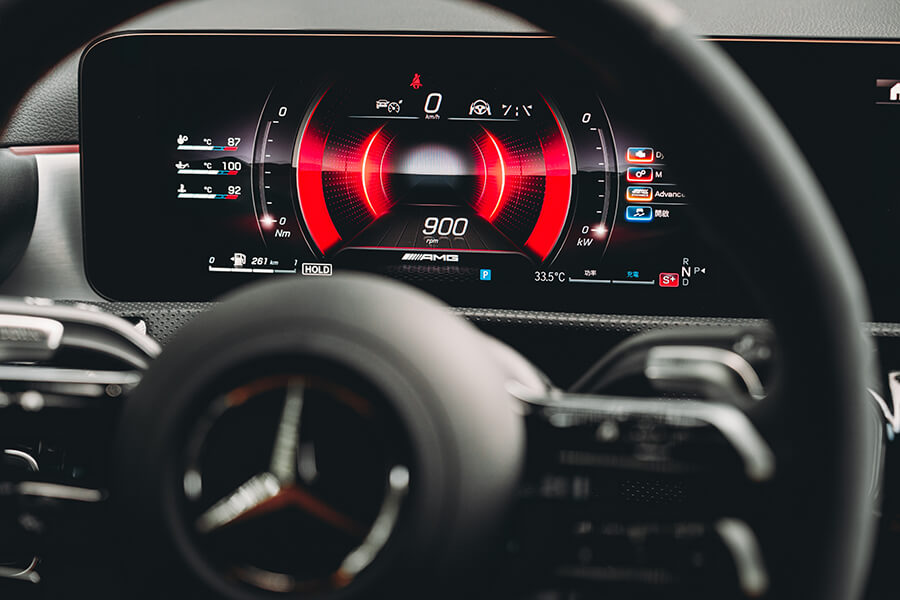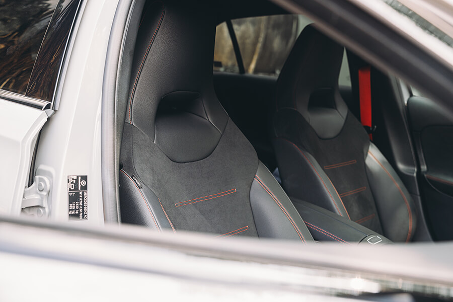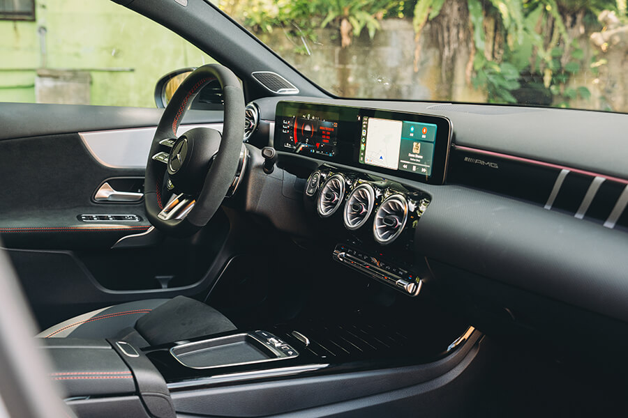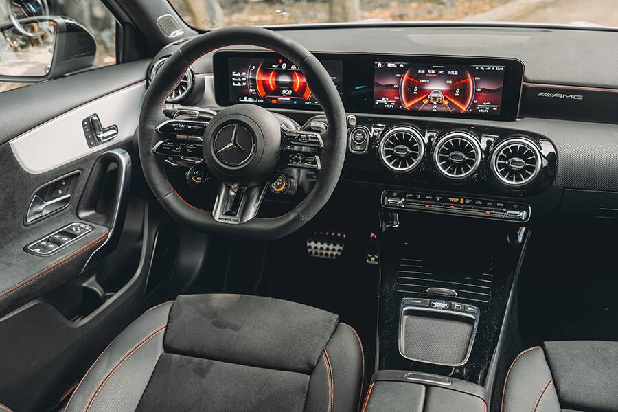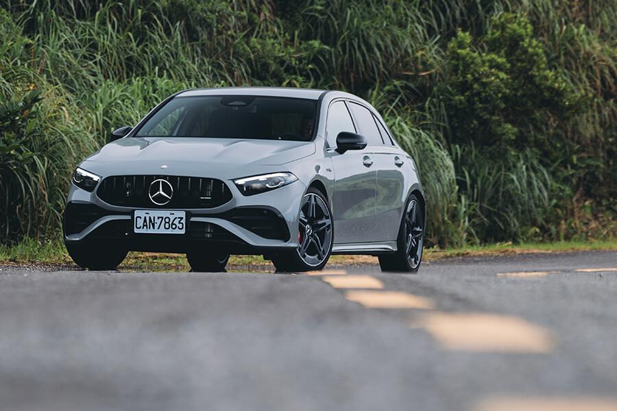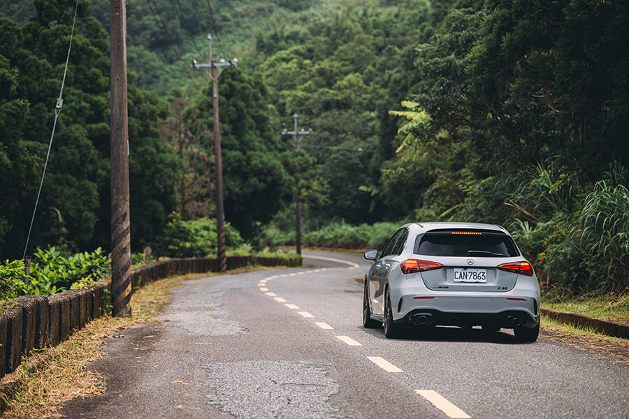 再跳進車內,你會知道剛才的皮相不只是虛張聲勢,當亮黑與霧銀交疊的內裝遇上了大量麂皮包覆與紅色縫線的高調收邊,64色環艙氣氛燈與副駕前方的 AMG 字樣與貼花,讓精緻鋪陳與性能風味並存。事實上在來時的路上,光是在市區內置身跑車座椅、繫上紅色安全帶,腳下加速踏板驅動的不光是前方的M260四缸渦輪引擎,還有來自48V的額外14匹助力,起步瞬間就能帶著輕快果決的衝勢向前一蹬。眼前的儀表與多媒體螢幕儘管已備妥 Apple CarPlay 與 Android Auto,在這輛 A 35 上,我卻只想將儀表調到轉速置中、油水溫度與電控設定在兩側成排顯示的運動模式,再打開引擎出力的即時顯示,配合引擎、與甚至在 Comfort 模式就顯得相當狂妄的排氣聲浪模擬中,感受這輛車的生命力。