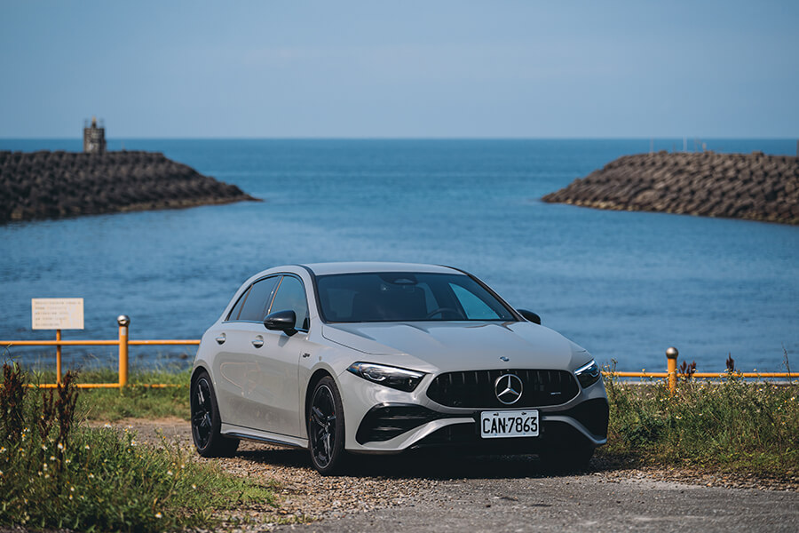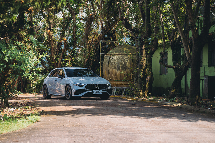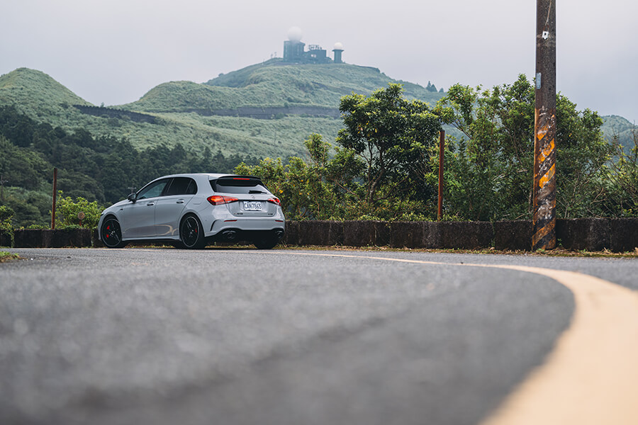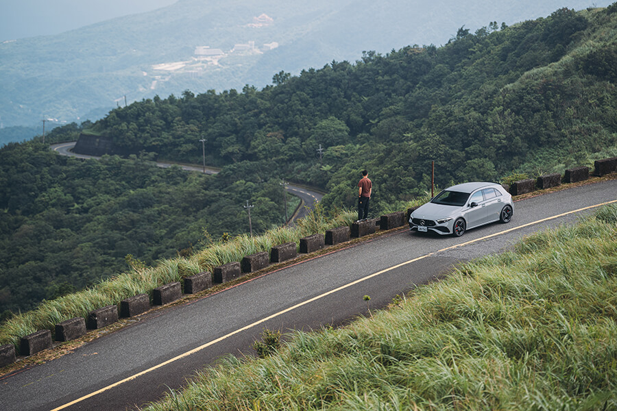 理由?我當然是不會向你洩露這其實是一時私心想來這兒散散心嘛,但其實為此我也準備了一個相當充分的絕佳理由——請推開門來到車外、看看今天開出來的這輛25/26年式 Mercedes-AMG A 35 4MATIC 摘星版 吧。一身披著 MANUFAKTUR 特殊色的 Alpine Grey 層峰灰車漆、配上遠處層巒疊嶂的空濛山色,兩者是不是一拍即合、甚至還為眼前風景更加增色?
