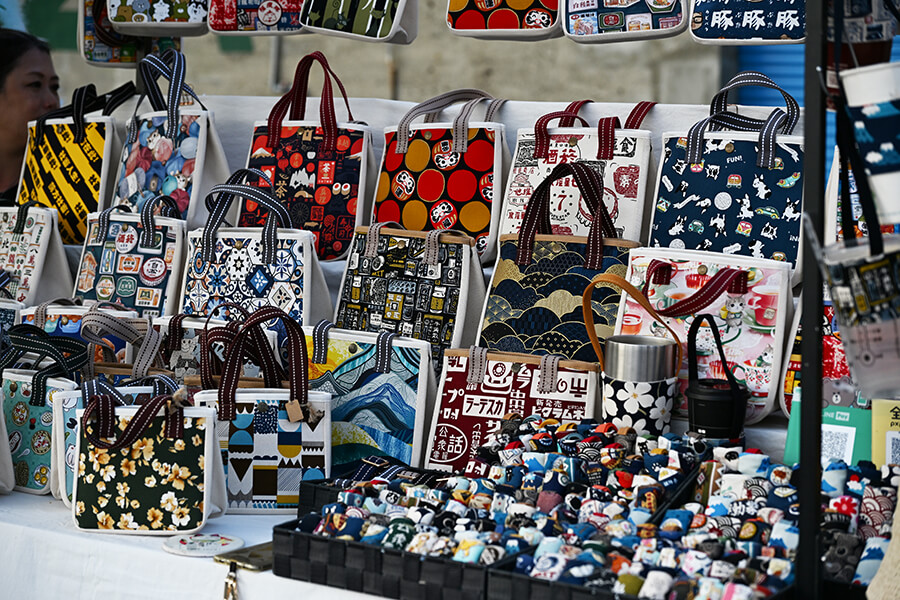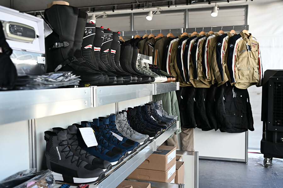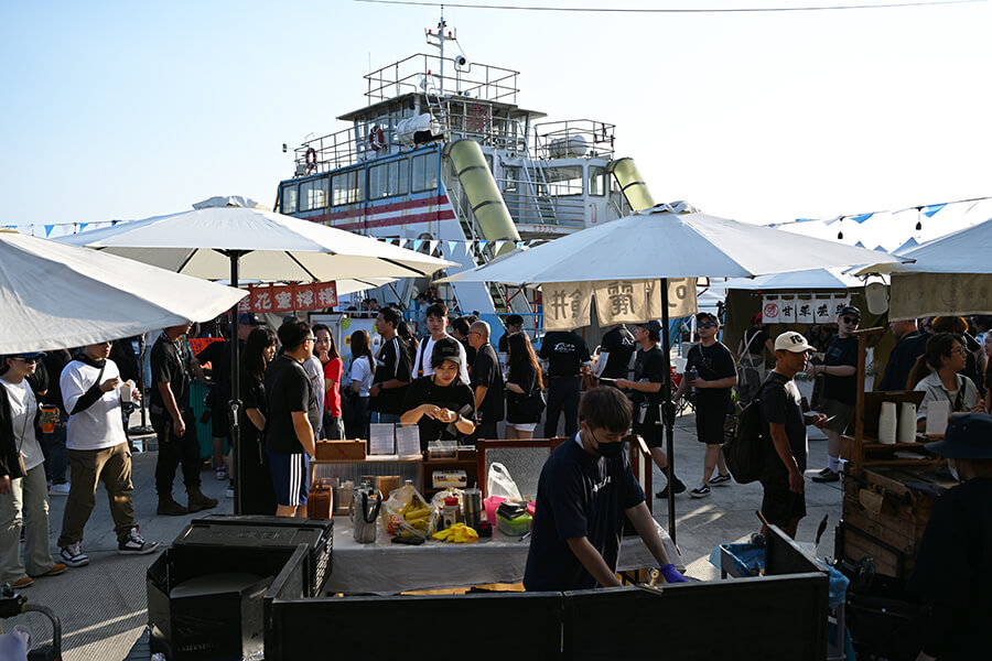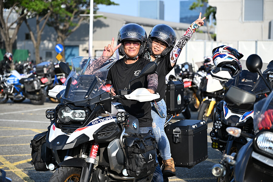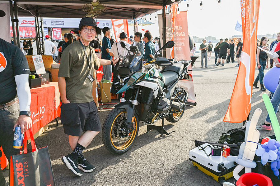 眼看時間尚早,中午我穿過大港橋至對岸小歇一會;再回來時的高雄港棧柒庫竟已停得滿滿滿、來自各地的車隊陸續進場,一旁的市集也逐漸人聲鼎沸;一旁贊助商攤位也各自帶來了輪胎、行車紀錄器、車用零配件與工具。有的則利用自家產品結合BMW Motorrad,推出令人難以抵抗的周邊商品。而所有車友在報到時都能拿到大會園遊券、商品券,搜刮一輪後還能在壽山輪旁設置的一塊富熱帶風情的休息區邊吃喝邊欣賞小舞台上載歌載舞的演出。對於那些遠道而來、精力卻尚未被騎車耗盡的朋友,亦有射飛鏢、以及一個看起來得使勁在戴著安全帽的頭上使勁對氣球打氣、直到它”啵”一聲破掉的遊戲讓各位持續放電。