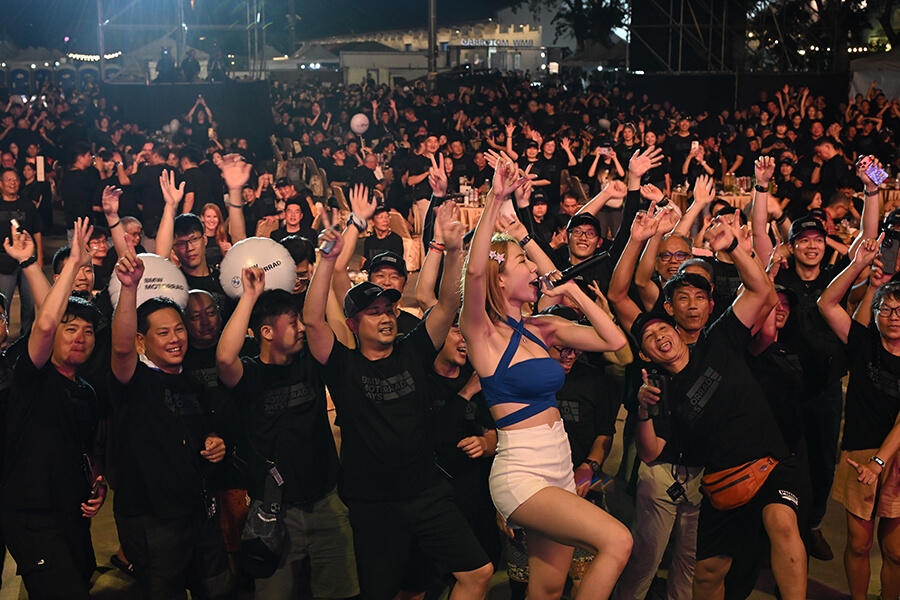 令人放鬆的氣氛讓時間彷彿凍結,一直到太陽逐漸落入旗津的珊瑚礁岩壁、金黃的霞光流滿天際,才令人驚覺時光的流轉。於此同時晚宴會場門口的燈光已經亮起,多達176桌、超過1700名車友的盛大場面前早已有DJ在落日餘暉前放出強力節拍為晚會暖場。席間車友品嘗著道地辦桌菜、啜飲單一麥芽威士忌(騎車請勿飲酒,但許多人都是要在此留宿一宿啦),台上表演陣容更是精彩絕倫,有經營近30年的HOt SHOCk哈騷客樂團、多度入圍金曲獎的阿布絲的勁歌熱舞,還有令全場嗨翻的歌手卓文萱。而除了表演間陸續抽出百餘項獎項,活動尾聲更抽出了價值超過七萬的GS Rally以及XRIDE騎乘套裝。但這都還不是今日的最大獎,在多達二十萬的購車金頭獎得主出爐、與各地車隊紛紛舉起旗幟台上台下滿場繞行開心舞動,是這場大會師氣氛最高潮的壓軸好戲。