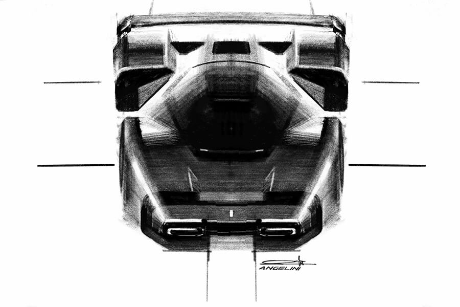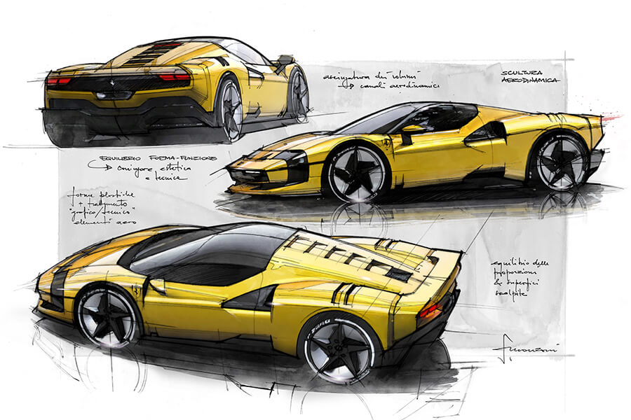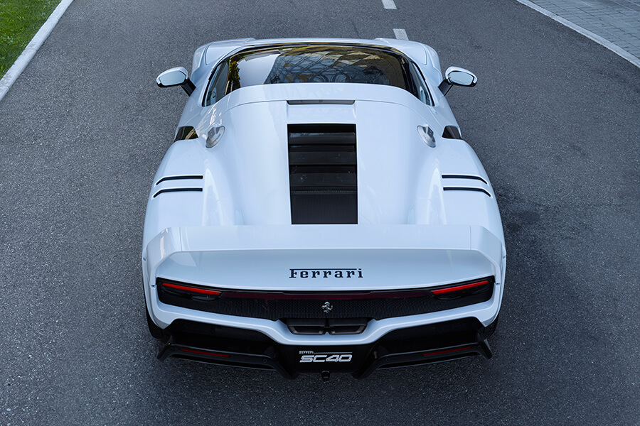 從低矮的車頭、到固定的尾翼,法拉利設計總監Flavio Manzoni 指示他的團隊運用工業設計美學,賦予SC40既稜角分明又充滿曲線張力的造型,以仿效F40的設計語言。方形的頭燈一路自側邊滾落、延伸至下方兩端的進氣口,再與前方橫亙全寬的進氣口構成這有點熟悉、卻又截然不同的造型。