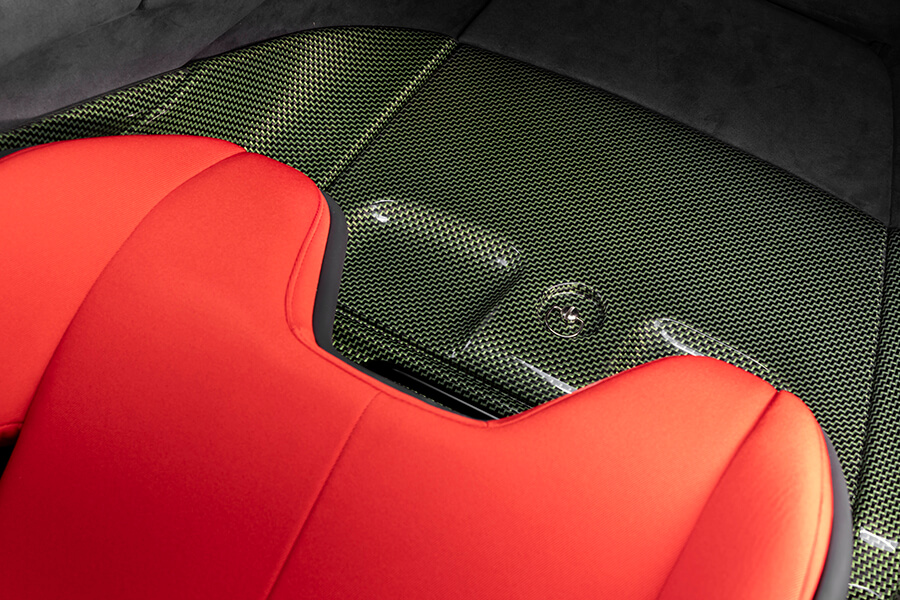 重新設計的內裝裡有著大量的Kevlar纖維運用,遍布腳部空間、置腳墊處乃至於座椅後方,方向盤、儀表板以及內飾、引擎室與保險桿亦如是。至於在車內沒有Kevlar纖維的地方,幾乎便由大量Alcantara布料所覆蓋。