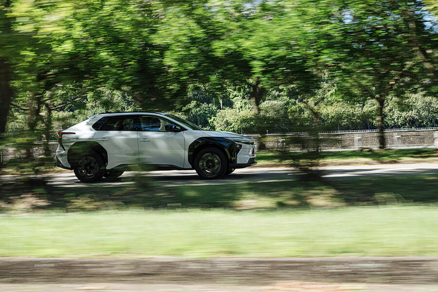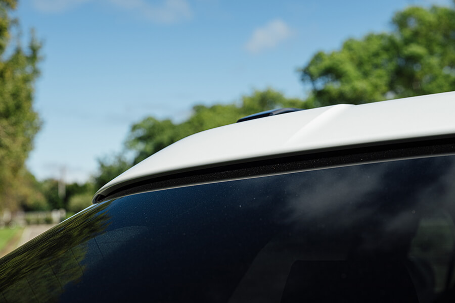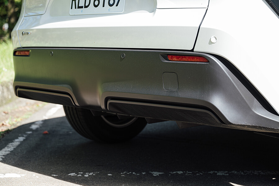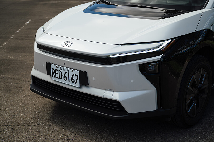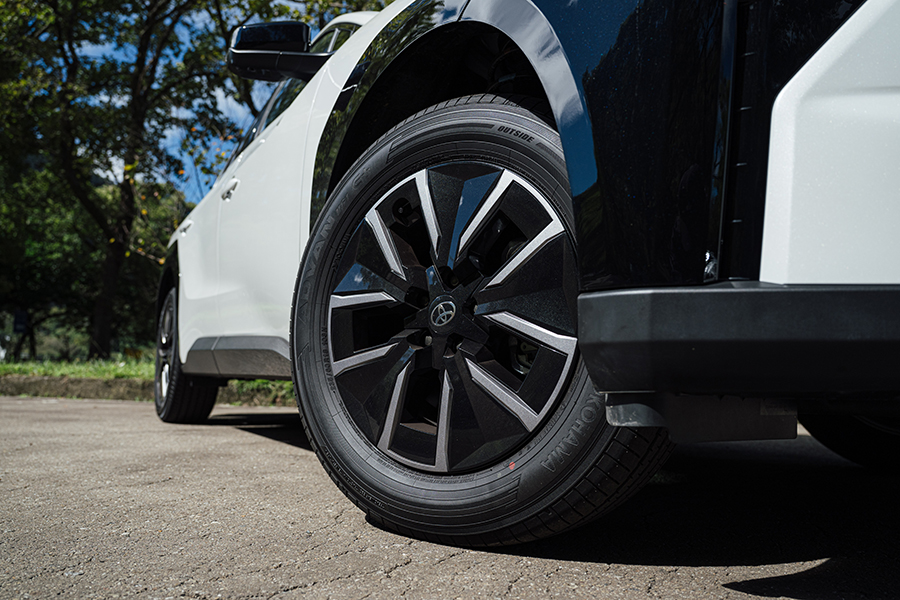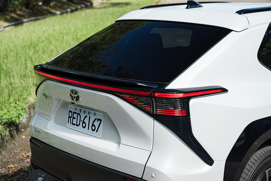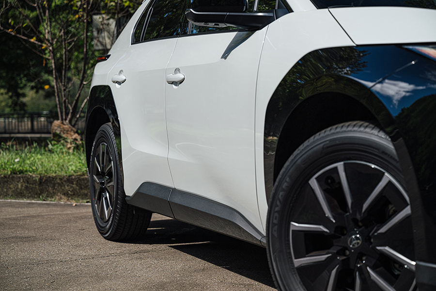 不過這也是我頭一回接觸bZ4X,首先在外型上就為我帶來好感。雖然立體塑型看似大同小異,但頭燈設計則由原先好似Crown身上帶有的立體摺線,轉為如今在 Toyota 各車型上遍地開花的髻頭鯊日行燈設計;由塑料材質改為帶有黑色亮面烤漆的輪拱前緣,則巧妙融入兩側導流氣簾、同時容納LED頭燈在其中。不知道是否因為在Prius、Camry等帶有”油氣”的車型上見過類似臉孔,又或者這次重新開臉果真經過細思量,bZ4X的新樣貌並未使人下意識地查覺到這其實是部吃電的中型休旅。或許是因為那依循氣流走勢、卻依然肌理分明的車身摺線,為它帶來氣力十足的外觀印象吧,不過電車終究講究的是風阻係數,車尾的斜背造型如今也把起先的尾翼改為平滑的圓角,末端的小型鴨尾與無後雨刷設計則同樣延續。修整得更加簡約俐落的輪廓,讓新車遠遠一看便帶有日本車過往特有的那種精緻、拘謹的斯文外觀氣息。
