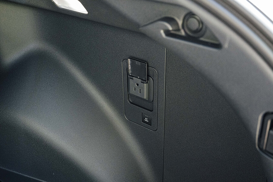 車內肉眼可見的變化就主要在於前方的中控光景。除了中央觸控螢幕自12.3吋升級至14吋外,下方延伸的鞍座空間也多了一左一右用以供應手機無線充電的大平台,充電感應上就算裝著手機殼也仍顯得十分靈敏,不過平滑的充電座表面有時就會讓手機抵擋不住慣性而前後左右亂飛,嗯,也或許是我魯莽的駕駛手法有待檢討……。來到車尾一腳伸出召喚同為此番新增的腳踢感應尾門,內部容納量雖然大同小異,但關鍵在於裡頭多了V2L反向充電的110V交流電家用插座,最高可支援至1500瓦。這代表甚麼呢?你可以將這車開到任意你喜歡的地方、停下來,拿出預藏的咖啡機、熱水壺、小烤箱準備在外簡單來場野餐,或是為投影機、筆電等數位產品供電,來場一車份的車上電影院;如果來到海邊戲水、或是不幸在暴雨中成為落湯雞,這套系統的功率上限甚至足敷讓你拿出吹風機打點好自己的窘境、重新容光煥發。