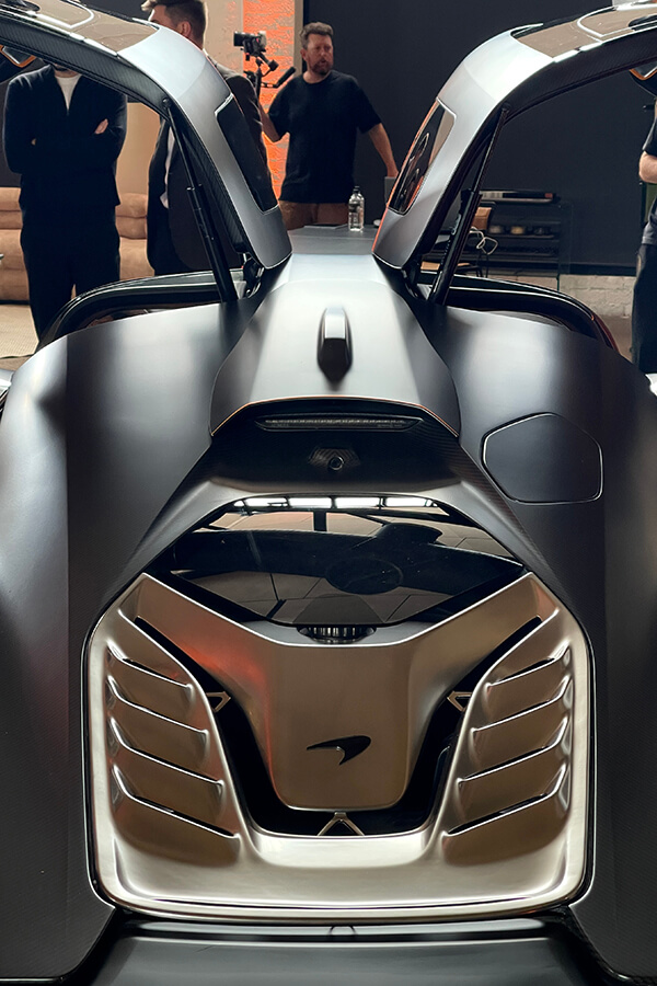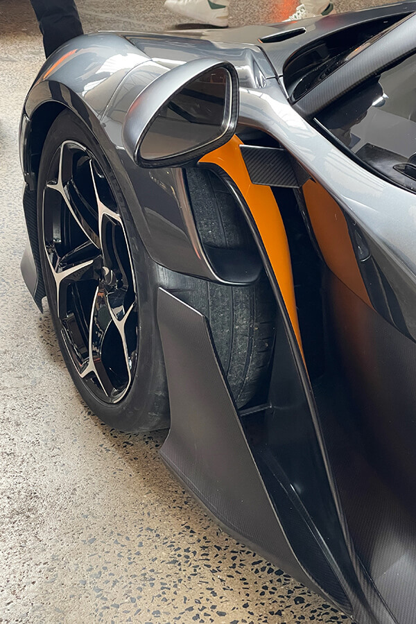 相較於主動式長尾翼及鷗翼車門,W1的面貌就顯得相當樸實無華,但畢竟車頭與氣流息息相關,主動控制的前導流翼與兩側氣流通道讓內裡配置清晰可見,前葉子板後方的排氣口和呼應麥拉倫廠徽的側進氣口線條都讓人驚艷,近距離還能看到一些照片上無法察覺的精美細節,這顯然都是空氣力學與美感之間劇烈拉扯後的成果。
