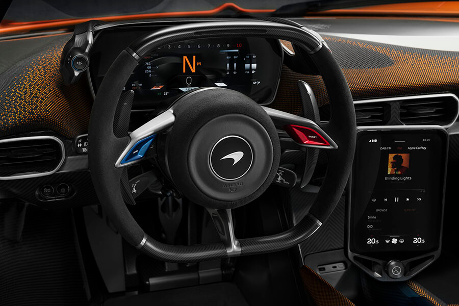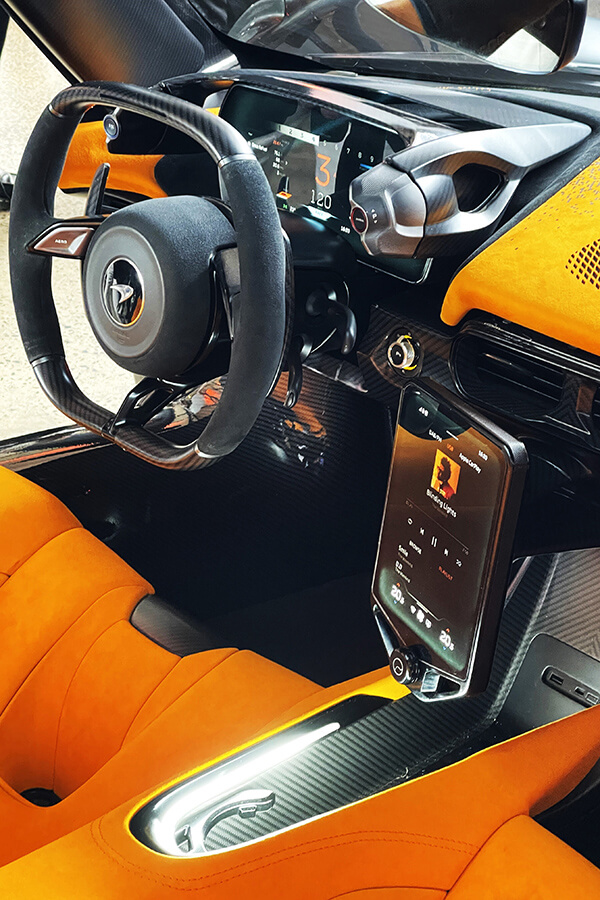 拉開車門,眼睛瞬間就被那橘黃色座椅搞得眼花撩亂,可惜因為是1:1展示車,無法坐進車內體會類似方程式賽車的坐姿,不過四處摸摸倒是沒問題的。固定式座椅的好處就是讓駕駛者可以坐穩中路,藉由踏板及方向盤的前後滑動調整來適應駕駛者的身材,其他如儀錶板及中央高解析度觸控螢幕就跟我們熟悉的麥拉倫沒有太大差別,操控和動力模式旋鈕設於儀錶板兩側,不過這次方向盤上頭多出了兩個快捷按鈕,右側是動力的Boost超增壓功能,左側則是Aero空力套件的DRS選項。