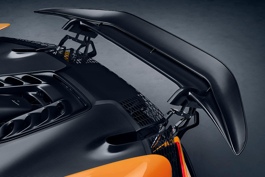 既然把1275匹馬力全部交給後輪,不可避免地,麥拉倫在W1身上植入了迄今最複雜、最先進的公路車空力平台,甚至導入全地面效應技術。為達成這個目標,他們打造了全新的Aerocell單體座艙──外型依照空力需求量身雕刻,座艙前方兩側刻意內縮、腳部空間抬高(原因後面會提及),並以「座椅固定、踏板與方向盤調整」的方式適應駕駛者身材的同時,並縮減艙體尺寸。這種設計我們在 LaFerrari 與 Daytona SP3 身上見過,而W1的版本更極端,甚至讓軸距縮短70mm。整個單體座艙並以F1、WEC等級的預浸碳纖維製成,將重量削減的更輕、剛性更高。