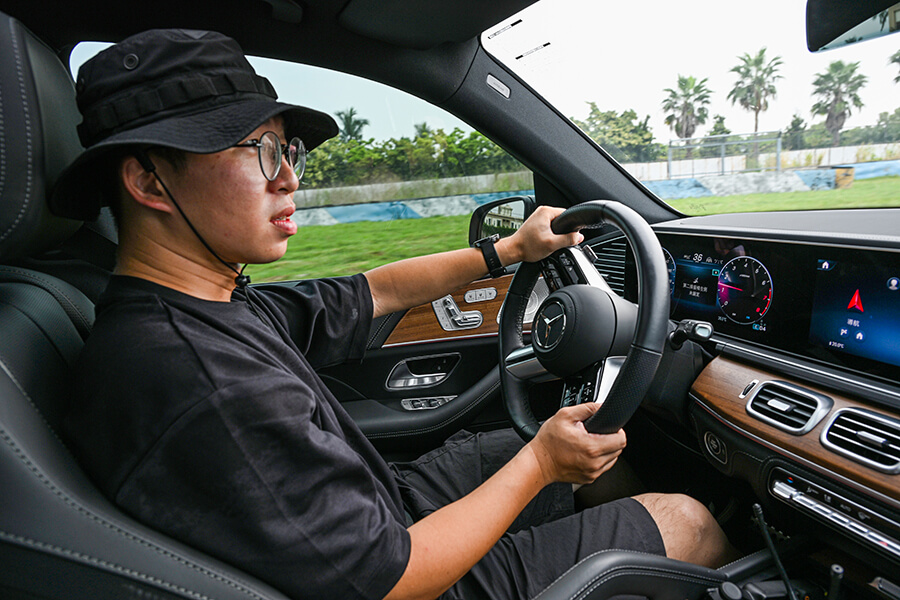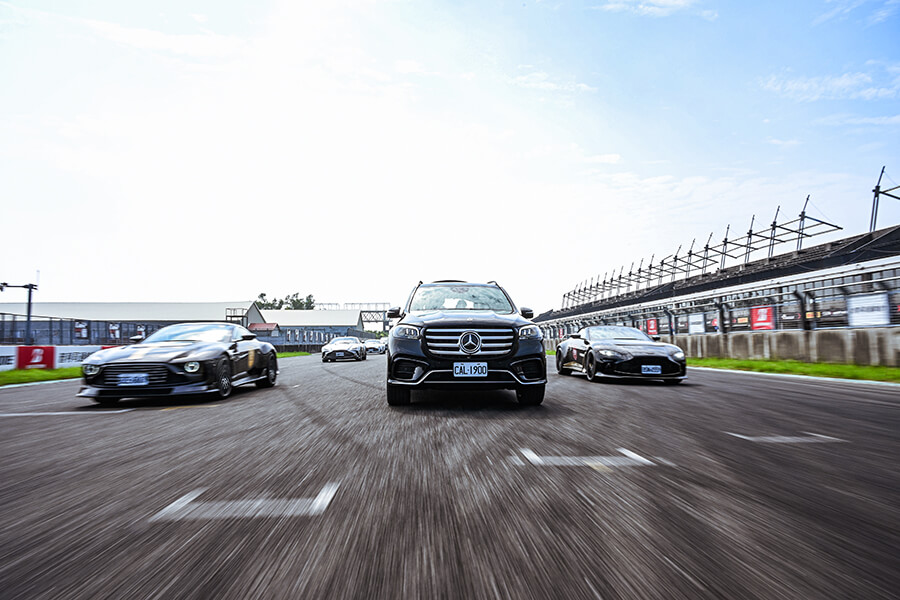 是的,我們真把這輛又高又大的正七座豪華SUV給開下大鵬灣賽道。欸……雖然並不是在裏頭全速衝刺,而是在最前頭擔任領頭兼攝影車輛。有鑑於賓士與馬丁近幾年同在F1場上輪流擔任安全車與Medical Car的角色,因此兩品牌同時出現在賽道上竟顯得十分自然;加上這輛GLS 450 4MATIC本就配備AMG Line套件,從車身頭尾造型、加大碟盤,再到車內的平底方向盤與不鏽鋼腳踏板都隱隱約約為這輛身長5.2米的大傢伙增添性能味。只見二三排座椅一放倒、兩位攝影輕輕鬆鬆鑽入偌大的後廂就位。當出發訊號一下,GLS 就與這數十輛馬丁在場上繞行了起來。而此車面對類似環境其實也還有招,當駕駛模式切至SPORT,動力輸出、氣壓懸吊、轉向手感乃至於ESP等都紛紛進入運動化設定,路感除了變得更加清晰、車頭隨方向盤指入彎中的反應與回饋也更加直接聽話,當然,除了速度並沒有真的很快之外,GLS在此狀態下依然維持著一定程度的優雅風範,否則一回頭可能就要滿賽道尋找丟失的攝影夥伴了……。