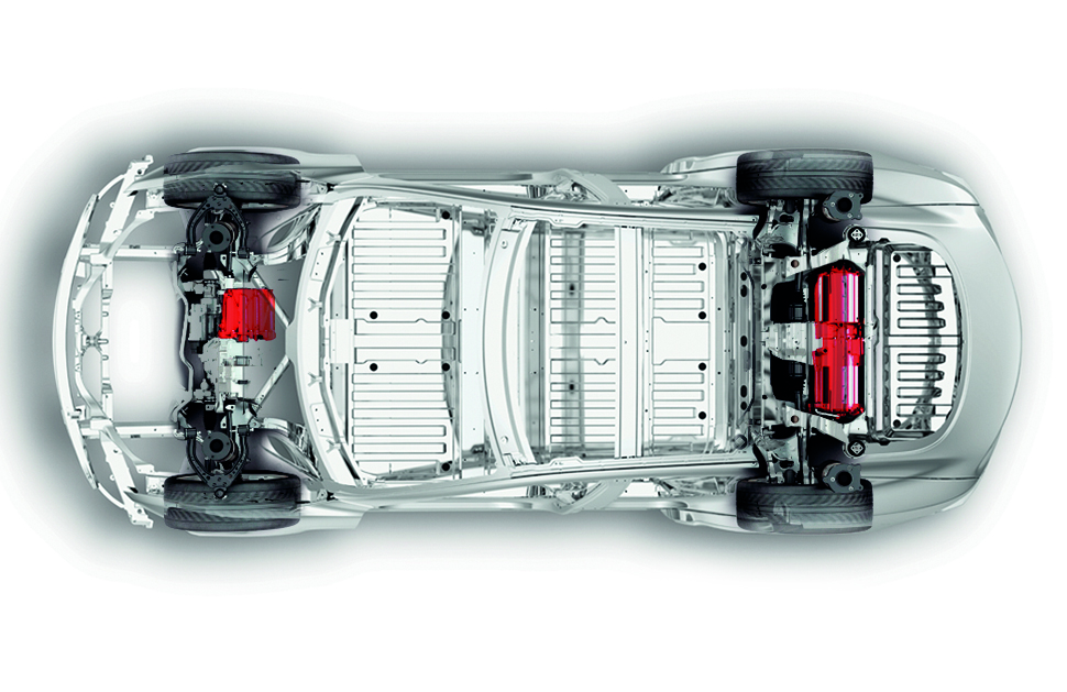 卸掉外殼剩下一副骨骼的電動雙煞,揭示了人類在石油大災難後必須徹底反思何謂操控性能。Tesla的軀幹全面應用相對輕盈的鋁合金,佔整體重量四分一的電池則藏在底盤,是以Model S的重心高度與法拉利458完全一樣。