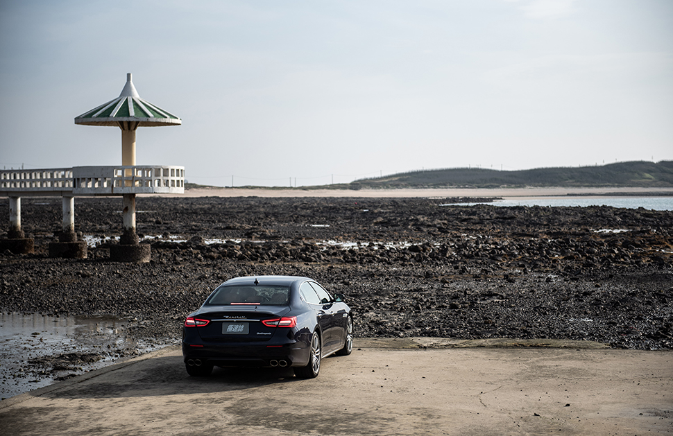 我們來到了一個不知名的漁港,同樣因大退潮的關係整個海水完全退光,只剩下黑色怪石林立的地形,彷彿來到另一個星球,這種景色是我從未見過的,此時身後突然竄出不知打哪來的小綿羊觀光客呼嘯而過,一看旁邊的指示牌,原來旁邊有一條路可以直通另一個景點,數千數萬年前因火山噴發後凝結而成的玄武岩就屹立在那兒,雖然沒有文字,但這些地質型態正清楚訴說著澎湖列島的歷史。是到了該往回程走的時刻,由幾個連續高速彎所組成的路段當然是順便一探Quattroporte Veloce底線的大好機會,畢竟它可是以Veloce(義大利文Fast的意思)為名啊,這車即便少了Q4四驅,但下盤功夫仍如同老樹盤根,350匹的力道猛而不狂,且善於傳情達意讓我有更多餘裕空間,不會誘使你踏入險境。