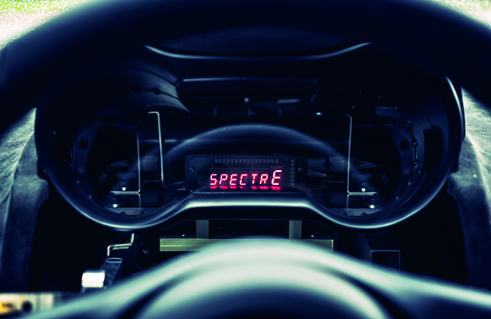 扣好安全帶,撥動開關。這個車廂給人的觀感和氣氛莫不勝似越野賽車,完全沒有隔音防震之類的舒適設計,純粹是一件工具,一件在鏡頭前劍氣縱橫的工具。發動瞬間的雷霆簡直石破天驚,數位儀錶同時忽明忽滅甦醒過來,紅燈頻閃湊成一個SPECTRE字樣,似乎警告來者莫要妄動。嘿!管他的,反正我們剛才已聽過很多口頭警告。