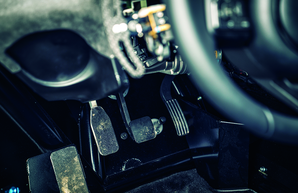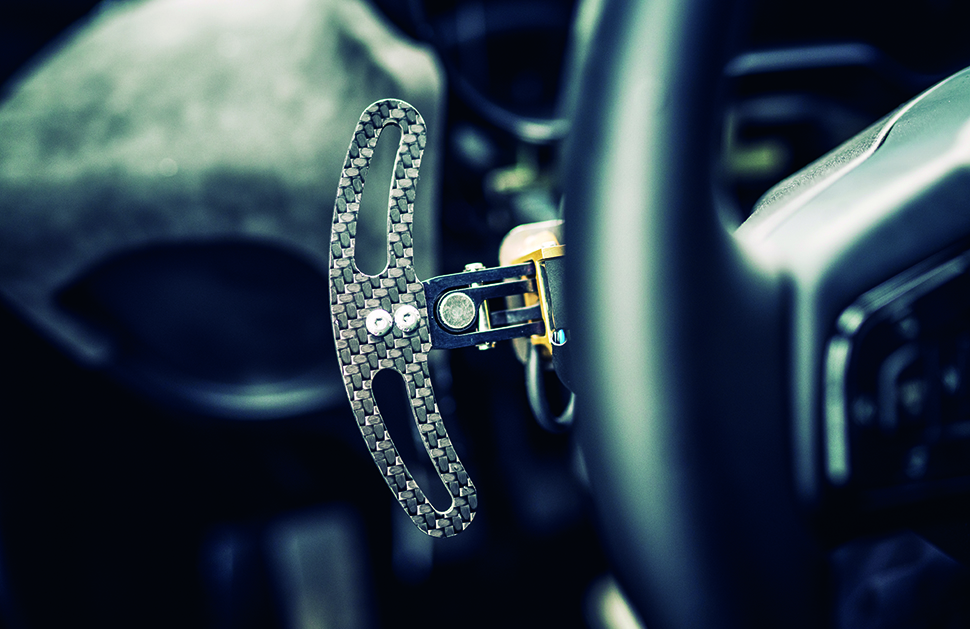 換檔功夫只靠方向盤左邊的單一槳翼,變招只消一推或一拉。只用單槳,因為方向盤另一邊被另一個觸發側滑的裝置﹣﹣液壓手煞車占用了。這個手煞無疑令C-X75如虎添翼,甚至可以說是我迄今見過飄移步法最準繩的快車,套路挺像Caterham,車頭一扭,車尾馬上脫韁,車手可以利用油門調整姿勢,好不痛快。
