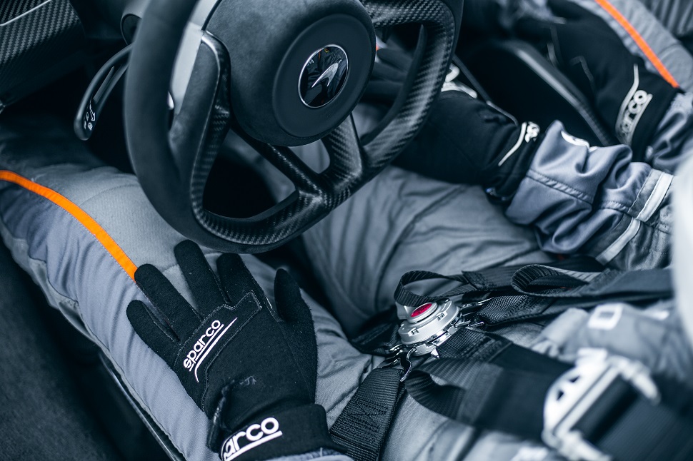 縮身跌進輕薄的碳纖桶椅,這張看起來就像只是在賽車椅上加了幾塊軟墊的椅子,應該毫無舒適性可言(上場後發現那軟墊效用極為神奇),工作人員幫我將六點安全帶的五個接頭一一插進快拆扣,隨著喀嚓、喀嚓的金屬聲,就在帶子用力勒緊的那一刻,整個車艙內已瀰漫著濃郁的戰鬥氣息,氛圍就像是比賽前的練習與測試,這時教練要我看一下上頭,啟動引擎吧…..,眼睛一瞄,懂了,抬起右手往上一指,那可不是故意擺出帥的姿勢給攝影拍照留念,而是Start啟動鈕居然設在上方,後頭開始傳來麥家V8渦輪引擎典型的低鳴進行曲,雖然此刻我整個背已濕透,但卻更顯精神。