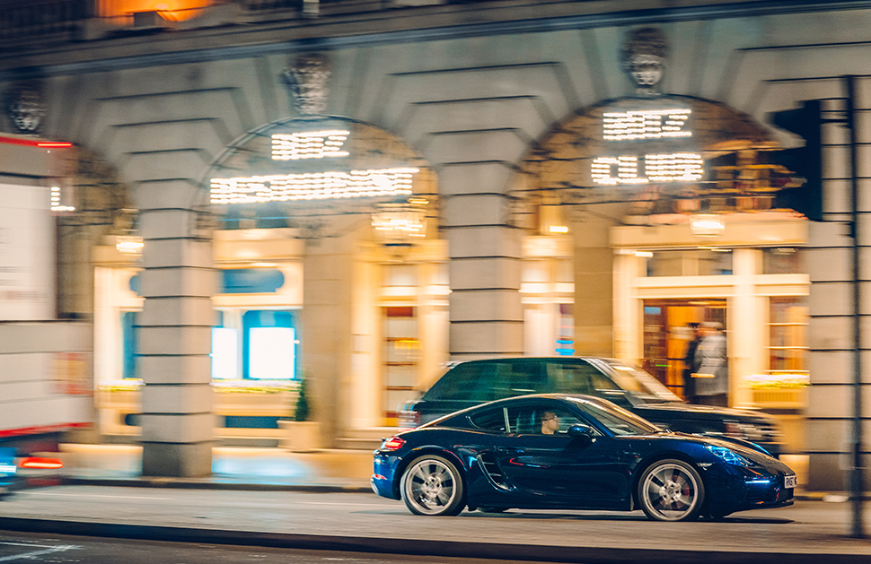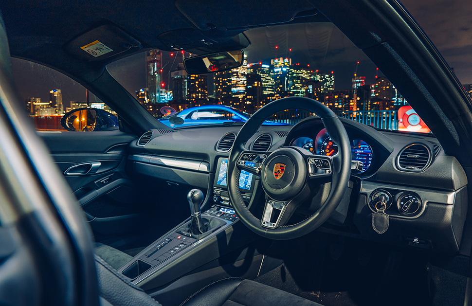 對方現身時,我正藏身於黝黑泰晤士河畔某卵石匝道下的陰暗處。來者是一部花枝招展的Corsa和飛雅特500,車門猛然打開後但見幾名青少年鑽出車廂,場上同時傳來一陣品味成疑的音樂和味道可疑的煙味。他們甚至開始載歌載舞,完全不以為意在他們的派對場地八公尺外停泊著一部夜藍色的Cayman,駕駛席上還有一個神情古怪的男士正在努力壓低身形。