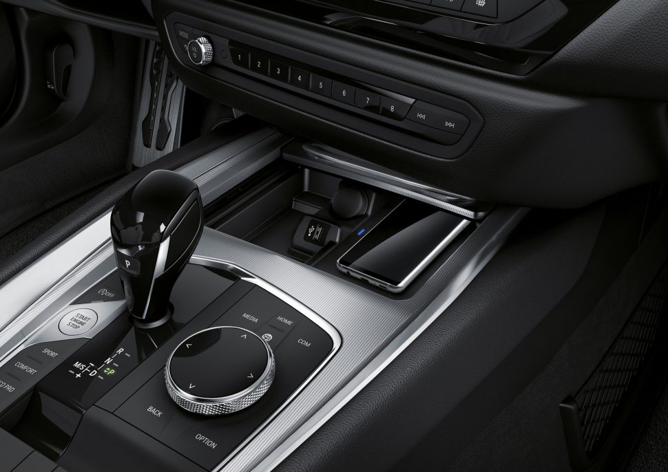 另一張中央鞍座的圖片則顯示iDrive主控鈕上頭同樣提供手寫面板功能,排檔頭的設計也加入更多變化,引擎啟動鈕更移到排檔頭左側,當然無線充電功能也沒有被遺落。另外,也可看出為突顯整體質感,面板與旋鈕加入更多金屬材質。