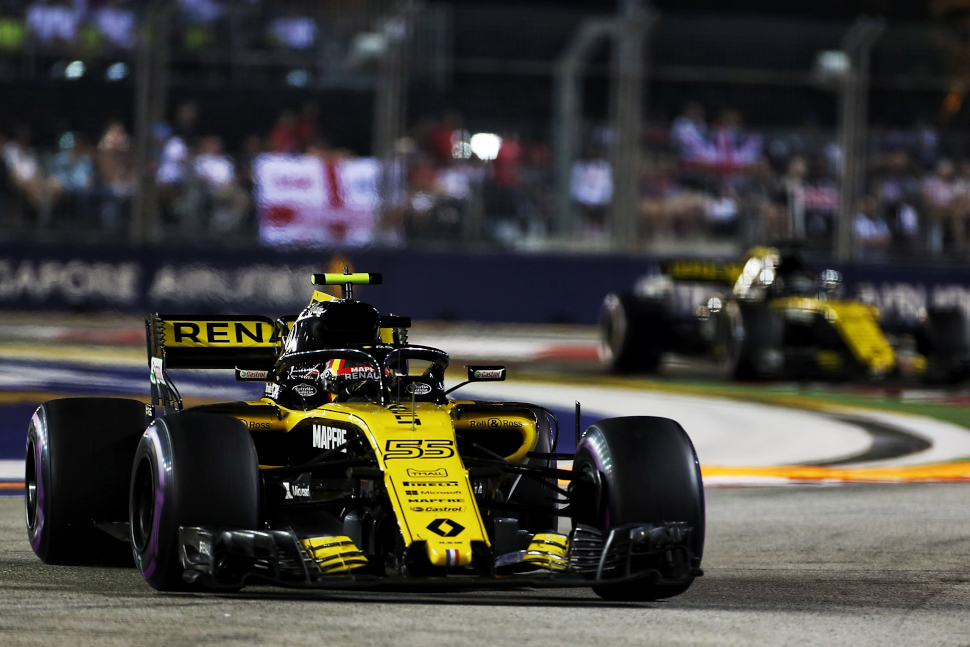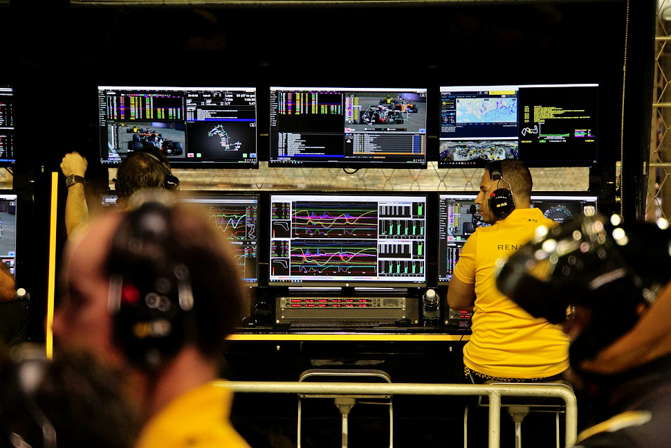 起跑後回到車隊休息室觀戰,老Calos(Carlos Sainz的父親,是前WRC世界冠軍車手)就坐隔壁,所有人都神情專注的盯著螢幕,一起跑20部賽車引擎全開的音爆讓情緒High到高點,這時所有賽車來到第一個彎角,沒想到Force India自家兩部賽車因擦碰導致Esteban Ocon撞牆退賽,引發安全車出動,看著畫面重播大家都抽了一口冷氣,接著賽事重開,時間就這樣一分一秒的走著,工程人員依Nico Hulkenberg及Carlos Sainz各自的單圈速度與順位,還有輪胎消耗速度計算何時進站換胎可以保有最佳名次,這不是只有車手與車手之間的決鬥,而是團隊作戰,車手光環全來自於所有車隊工作人員的協助。