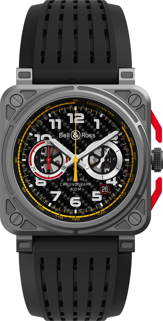 自動上弦瑞士機械機芯經過鏤空設計,賦予腕錶獨特的高科技風格的同時,其搖杆按鈕搭配黃色橡膠嵌件,30分鐘計時盤同樣以紅色醒目設計,賽車風格數位和凸緣黃色速度計儀刻度同樣融入賽車理念。在9點鐘位置,錶殼嵌有黃色橡膠拇指握,確保使用精密功能時達到最佳的人體工程學效果。最後,纖細指針和鑲貼時標塗有Superluminova®夜光材料,可確保易讀性。