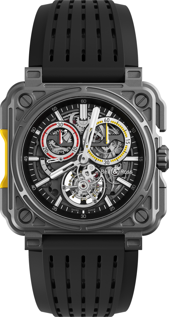 將飛行陀飛輪製錶工藝與單按鈕計時碼錶運動設計融為一體。陀飛輪可減少地球重力對機械機芯的影響,確保精準度。BR-X1 陀飛輪計時碼錶配備“飛行”陀飛輪,意味著外框架固定在軸上,給人一種懸浮感。搭載鏤空錶盤,計時功能區以黃色和紅色設計,可確保迅速識別時間。指針和時標塗有Superluminova 夜光材料,確保在夜間也可讀取時間的同時,錶殼對應9點鐘位置處嵌有黃色橡膠拇指握,使用時的觸感相當細緻。