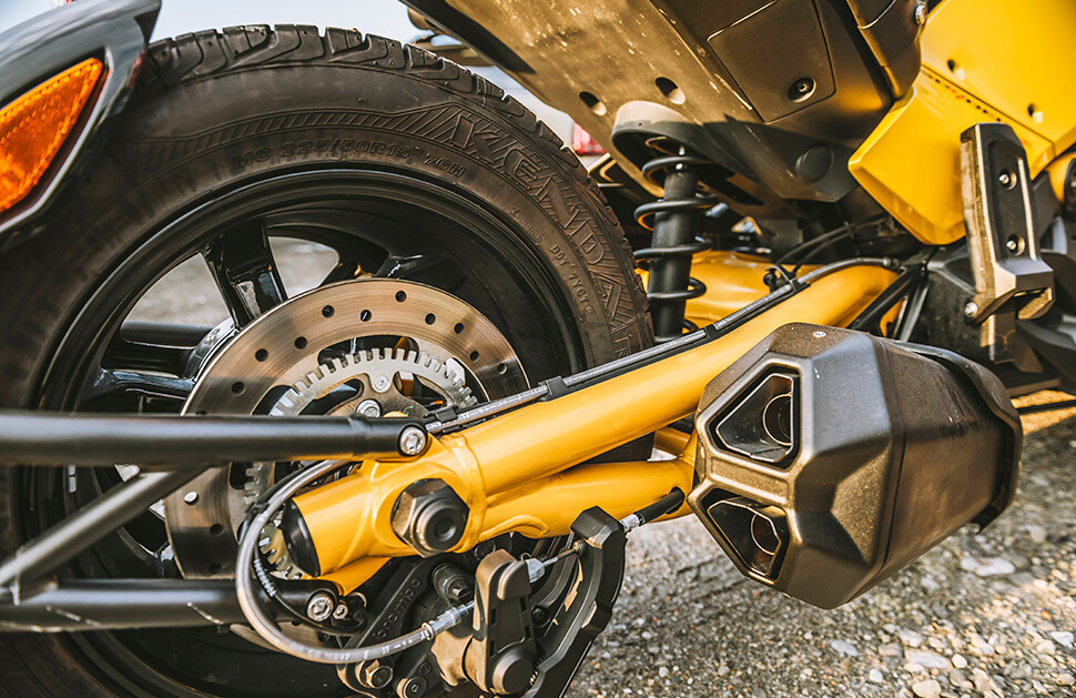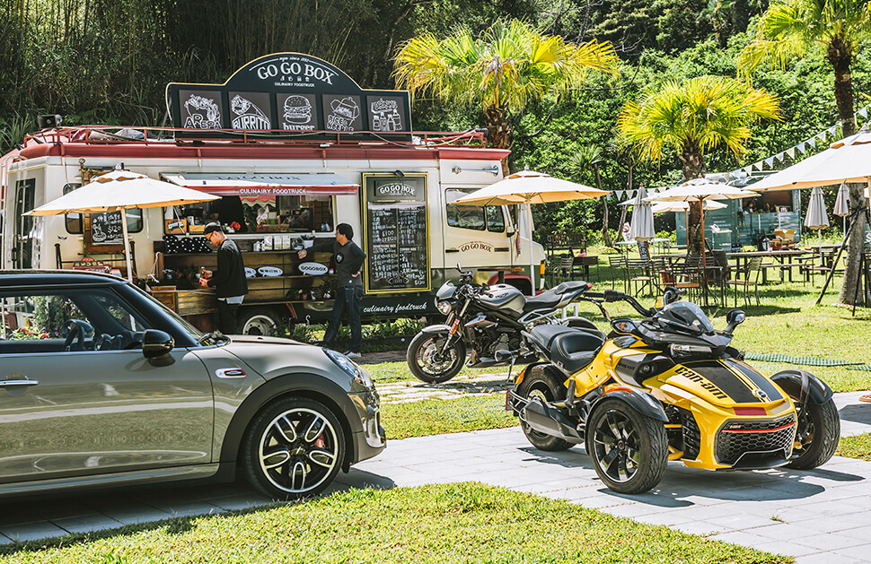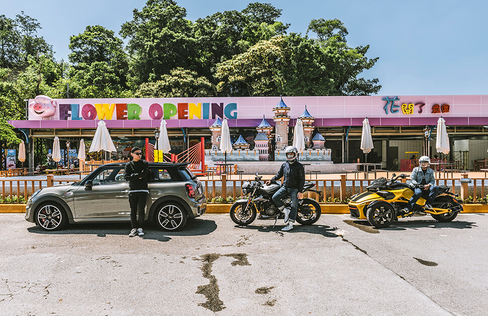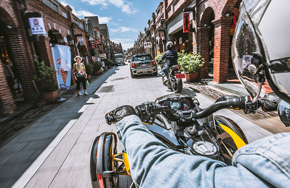 跨騎著二輪的好處就是無須為地形困擾,雖說後方的Jason騎著三輪Cam-Am好不神氣,概也是本周年出遊最為吸睛唯一成員,但一路上看著後照鏡的Cam-Am跟身旁的Mini JCW大小毫無差別,Jason一定為此相當苦惱,胯下這多顆輪子的Spyder雖看似機車卻少了便利性,如遇塞車時段須力保良好姿態以示個人魅力,回程時小編換手短短不過幾公里注目觀禮後覺得,恐怕不如速速投回Street Triple身上才得以鬆一口氣。