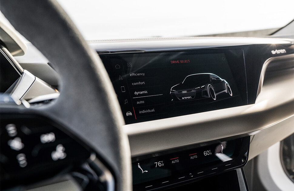 內艙裏,方向盤用上六角造型,中央鞍座相對於R8則是整體提高,大走簡約風格採用了布料座椅,至於皮料愛好者則千萬不用擔心,確定量產車上依舊能選上真皮覆料,總而言之,E-Tron GT內裝鋪陳就像是輛四人座R8呈現。