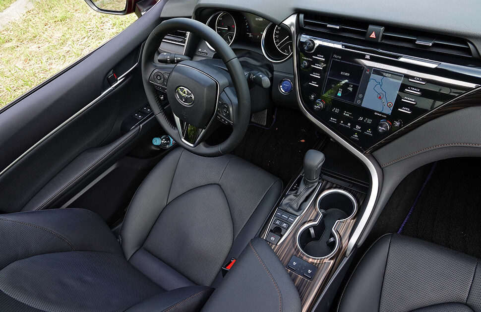 囂張至極四字,絕對是目前豐田的貼切寫照,有著全新並且相當靚眼容貌不說之外,在國人安全意識抬頭的前提之下,全新Camry納入TSS系統、七具氣囊、BSM盲點偵測、RCTA後方交通警示皆列佛心為全車系標準配備。內艙則有別於C-HR及Auris過於浮誇鋪陳,小編更是私心偏好Camry帶來的溫韻,明確地將駕駛及乘客的區分的相當明瞭清晰,方向盤及中控台的位置導向車手全權掌握,副駕則由3D效果十足的木紋飾版圍繞著,整體車室規劃往老大哥凌志靠攏的相當明顯吶,比較令我詬病的則是偌大的方向盤口徑稍感笨矬,手感雖黏手盤上按鈕看來一個也不缺,不然,至少也給我個D把也好吧~