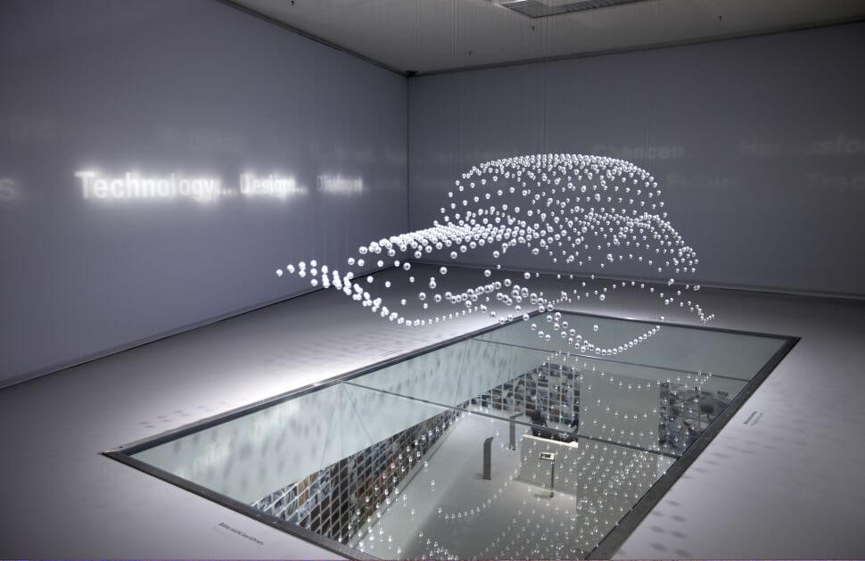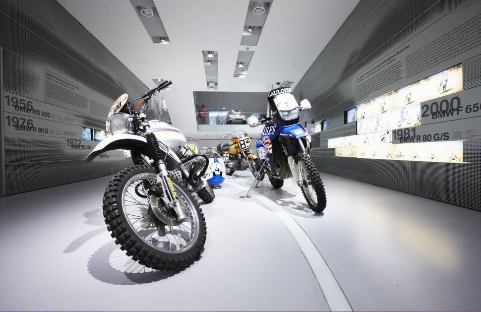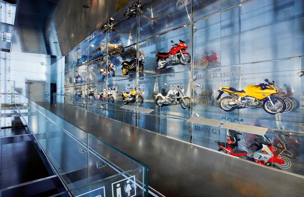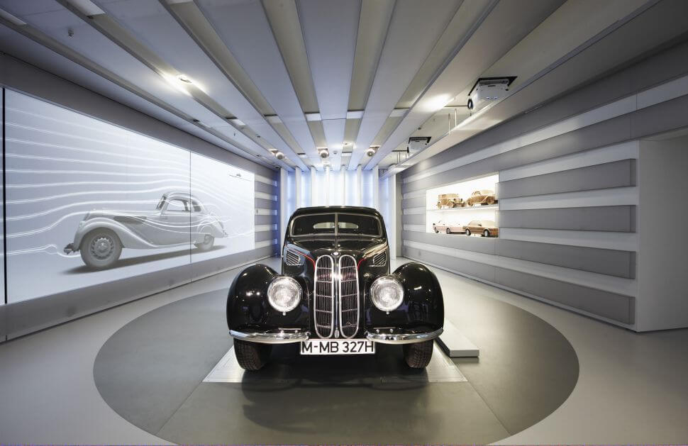館內分成7大主題,進入之後,迎面而來的動態球展示區彷彿讓人走進大觀園,透過電腦程式的安排,以鋼絲懸掛的714顆金屬珠隨著音樂產生波動,排列出各年代的汽車輪廓。館內蒐藏豐富,飛機、機車、汽車典藏星羅棋佈,若依照時代,BMW從航太轉向機車領域發展,館內展區前段正是一面三樓高的BMW機車歷史牆,歷年經典BMW機車浮在空中,像夢境一般。BMW在1923年造出第一部機車R32,BMW汽車則始於1930年3/15 PS。此車搭載輸出15匹馬力的748c.c.直四引擎,極速75km/h,經濟實惠的車格大獲好評。