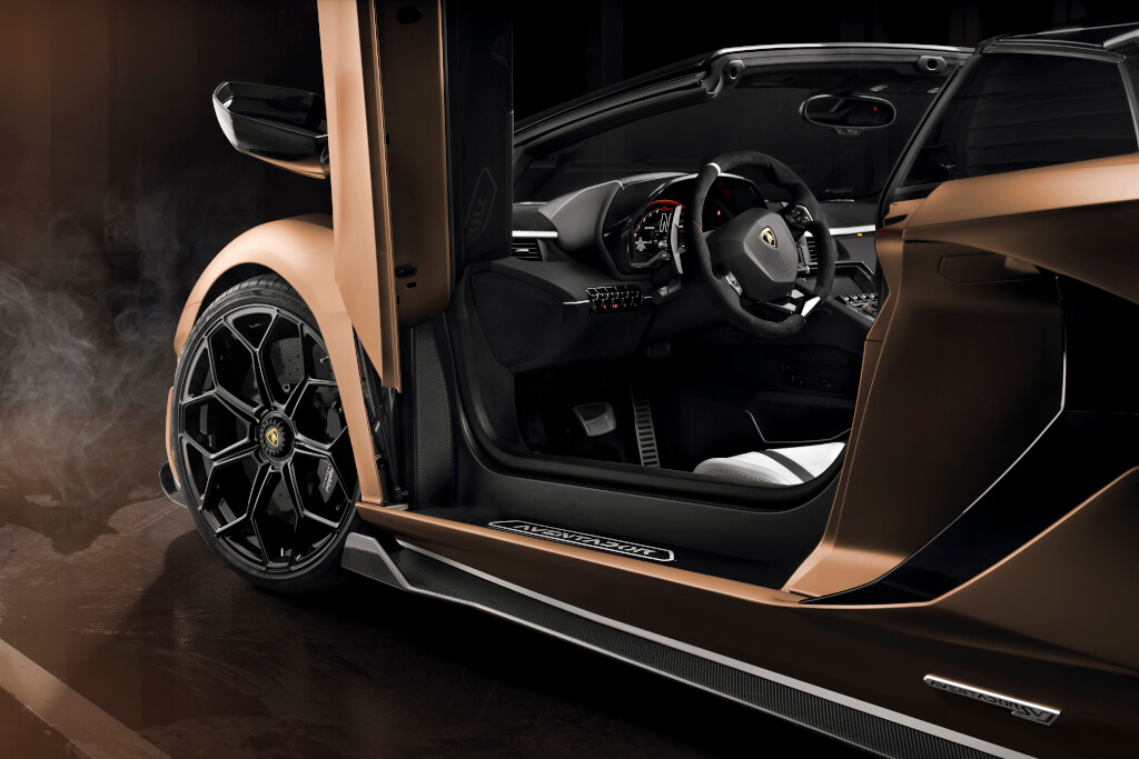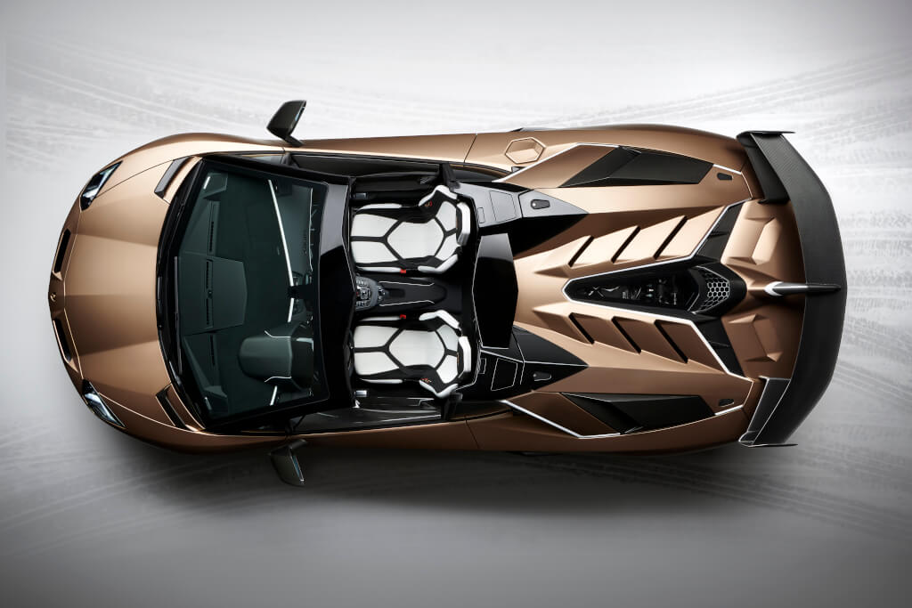 可拆卸的車頂由高壓RTM碳纖維製成,每片重量不到6公斤,1525公斤的總重亦只比雙門SVJ僅增加50公斤。這次的Aventador SVJ Roadster採限量800部的方式販售。而這次在日內瓦展出的消光青銅色屬於客製Ad Personam的項目,更加突顯前後保桿的鋒利線條並進一步豐富了專屬的引擎外罩。