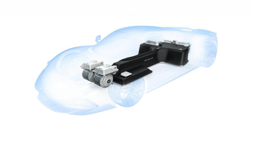 這部車使用碳纖維單體結構,電池安裝在駕駛艙後頭兩側並行成T字架構。電力系統是與Rimac共同開發(保時捷擁有該公司10%股份,而且也是阿斯頓馬丁、雷諾等車廠的純電供應商)。當然它依舊很重(聽說的,目前沒人確切知道它有多重)但Pininfarina堅持認為這樣的佈局可以提供最佳重量分配:四個電動馬達可以為每個車輪提供動力,它還具備適時的獨立扭力分配,但畢竟1,900匹馬力是一個大挑戰,前F1車手尼克海德菲爾德目前正與曾任職保時捷、帕加尼和布加迪的底盤大師彼得·圖策先生一起進行車輛的測試工作。煞車系統採用碳陶瓷碟盤和六活塞卡鉗,前碟直徑390mm、後碟為380mm。它的最大續航力約在483公里左右,並藉由快速充電站在40分鐘內充飽約80%的電力。