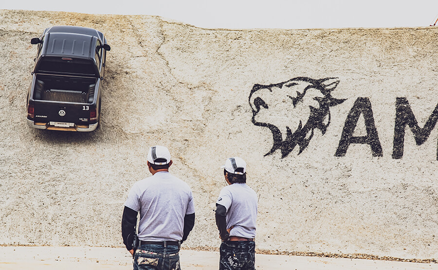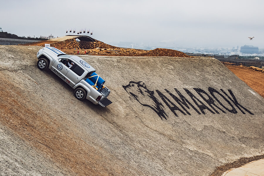 當然,出發前還是要來一趟教練示範圈,只見教練輕鬆寫意的抓好進入點,車子就穩穩當當的往坡頂爬去。這堵水泥牆的平均斜度有45度,而閣下看到在噴漆字體以上的坡頂處則是50度有餘,基本上已經超乎世面上大部分越野車款的側傾角限制,但廠方賦予Amarok的側傾角上限好巧不巧的就是50度,所以教練一副老神在在的爬上坡頂停住,並同時跟我閒聊他的皮卡經,但要不是座椅的側向支撐效果不錯,恐怕我已經是趴在副駕門板上不得動彈。輪到我們親自上場,教練們念茲在茲的就是上坡路線的選擇以及方向盤的控制,這主要是因為Amarok本車的多功能貨卡考量,略長的前後懸免不了壓縮越野時最重要的進入與離去角,未免造成磨下巴、掉保桿的險況,就要把握斜上、斜下的方式,這點跟開低底盤跑車算是異曲同工之妙。而橫越整個斜坡時,那個斜度還是令人心生不安,但Amarok就是老老實實的黏在斜坡上,這歸功於廠方在機械架構上刻意拉低重心的設計。