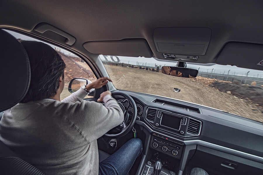 進到場地內,教練透過眼神與聲音提示我催落去,學員我自當不疑有它的踹下油門,大扭力隨即讓車輛往前飛奔,這時身旁教練悠悠說道:前面髮夾彎先走外道喔~差不多可以減速了,但是在砂石路上減速又是一件學問,因為你需要的距離比平時多很多,而在我踩住煞車的當下,教練又不慌不忙的說:可以打方向囉~,於是Amarok就這麼華麗的滑進彎,看到機會就立馬在補點油門出彎,是不是覺的剛剛這段畫面很輕鬆?其實我的脖子在壓過大小不均的砂石顛得滿不舒服,後面攝影阿加的相機要是窗戶沒關,肯定也會飛出去。