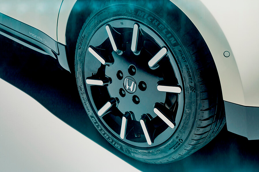 雖說續航力有限,電池不太沉重卻暗示E Prototype的運動性能有望與其他先天條件相得益彰。第一個條件是姿態——E Prototype的車身長度比本田Fit短10cm,套上米其林Pilot Sport(225/45 ZR17)的17吋輪圈十分貼近車身四個角落,分別被造型含蓄的橫練輪拱包圍著,換個說法就是備齊令人眉開眼笑的諸般功架。
