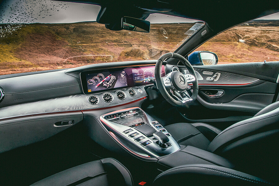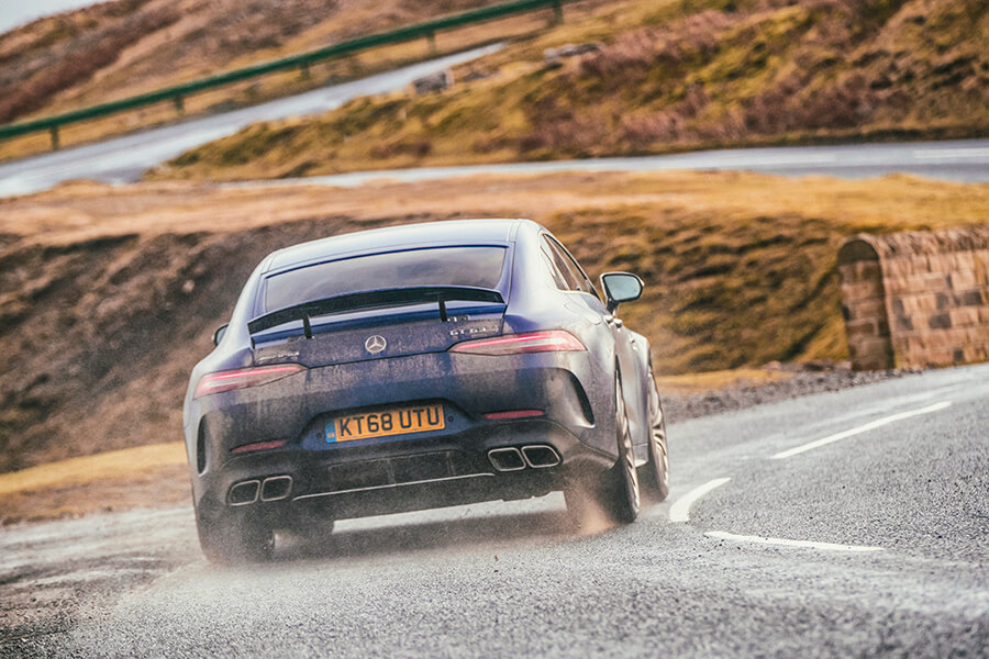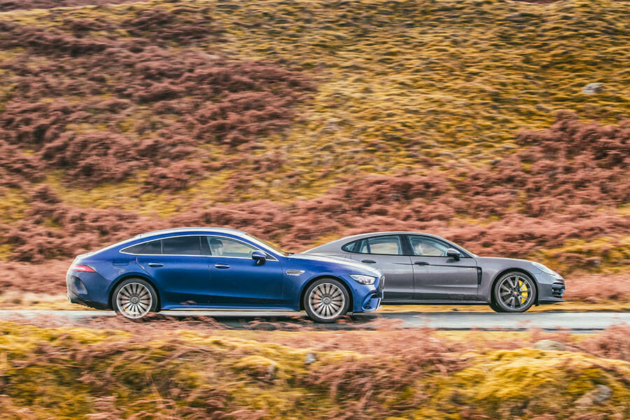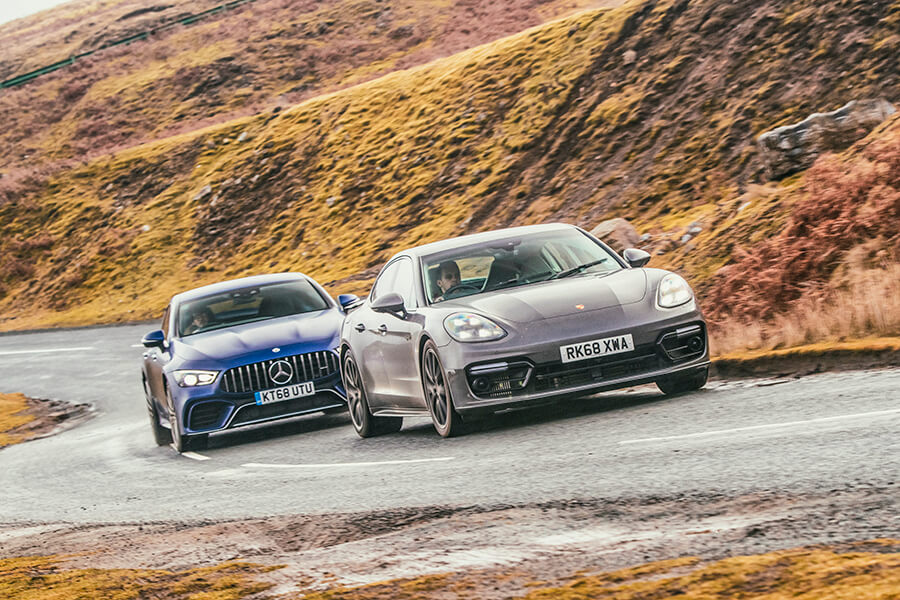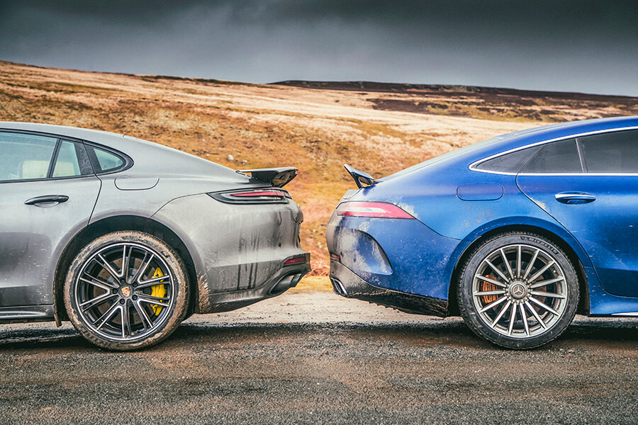 賓士倒是通情達理。若說這兩件作品佔據著豪華房車和高性能房車之間的無人地帶,保時捷性質上會比較接近前者,賓士則偏近後者。放諸英國一般B級道路,兩者的分別感覺上不是那麼大(儘管差別實際上會稍為擴大),所以車手有更多機會放膽尋樂,在情況有變時不用畏首畏尾。它們的轉向系統非常精準敏銳,輕重恰到好處,而且GT四門的後軸具有轉向功能,鑽進彎角時的輕靈程度就像重量一下子削減了半噸,車身彷彿比實際長度縮短了三呎(Panamera也備有四輪轉向選項,不過這次測試的一部未選用這個功能),感覺上比Panamera精於舞刀弄劍,身上縱有大量高科技裝備防止車手行差踏錯,干預手法似乎也比保時捷來得自然。所以整體感覺上比較好玩有勁,劍氣較濃,趣味甚至更勝E63,這可是非常了不起的事喔。