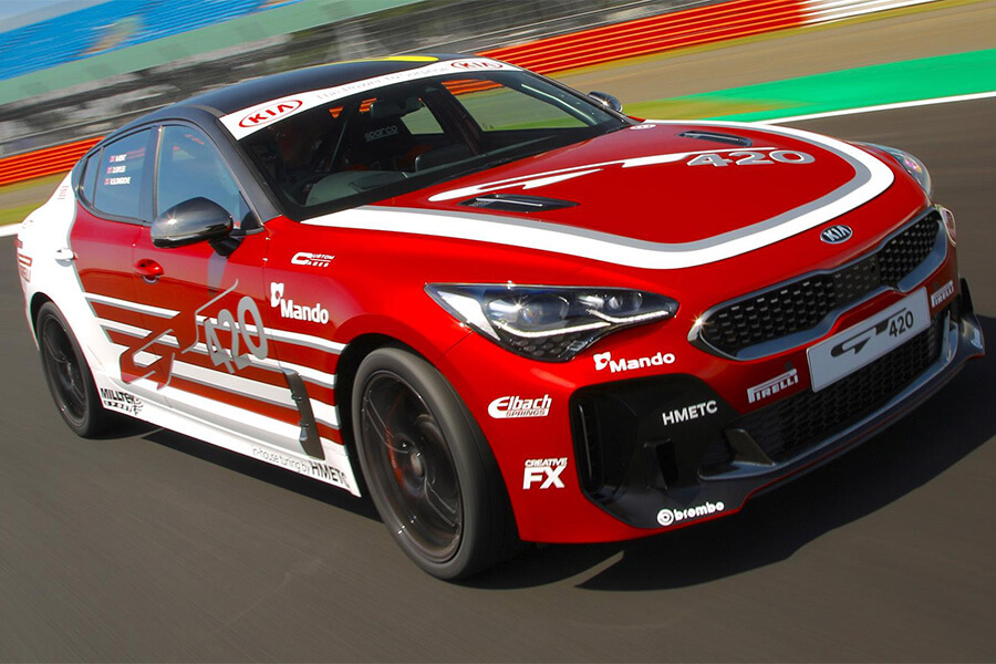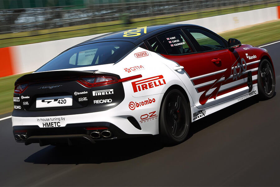 為了賽道日活動,英國起亞特別和現代汽車歐洲技術中心特製一輛性能更加威猛的Stinger GT420。以Stinger GT S的V6雙渦輪、365匹馬力為基礎,換上新的火星塞、空氣濾清器、Miltek排氣系統,以及一些微調後,升級版刺針性能調升至420hp馬力、52.2-57.3kgm扭力。透過更大的變速箱冷卻器和程式改寫,8速手自排的換檔銜接也更加快速。