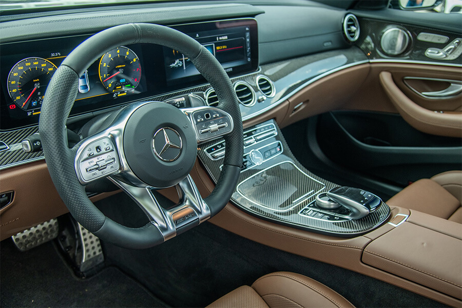 AMG E 53車內以霧黑色梣木飾板和Nappa真皮營造高級質感,並與AMG皮椅與AMG高性能跑車方向盤突顯53車性的運動性能。64色氛圍燈與12.3吋中控螢幕則增添不少時尚科技感。除以上配備外,安全防護層面亦配有其中包含:DISTRONIC智能定速測距輔助、智能轉向輔助、主動車道維持輔助、閃避轉向輔助、主動防撞輔助含路口車流辨識、PRE-SAFE主動安全防護與PRE-SAFE PLUS主動後方安全防護等與Mercedes me connect互聯功能整合的完整智慧駕駛輔助套件。