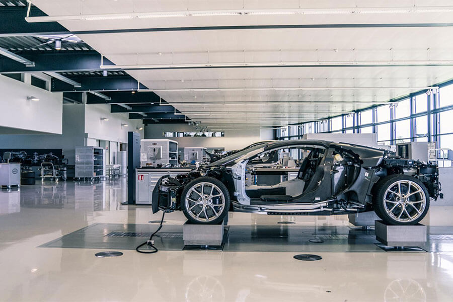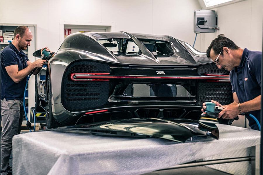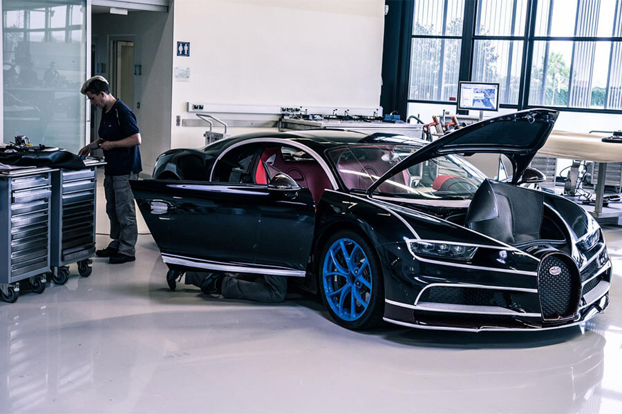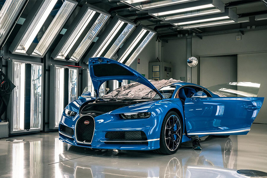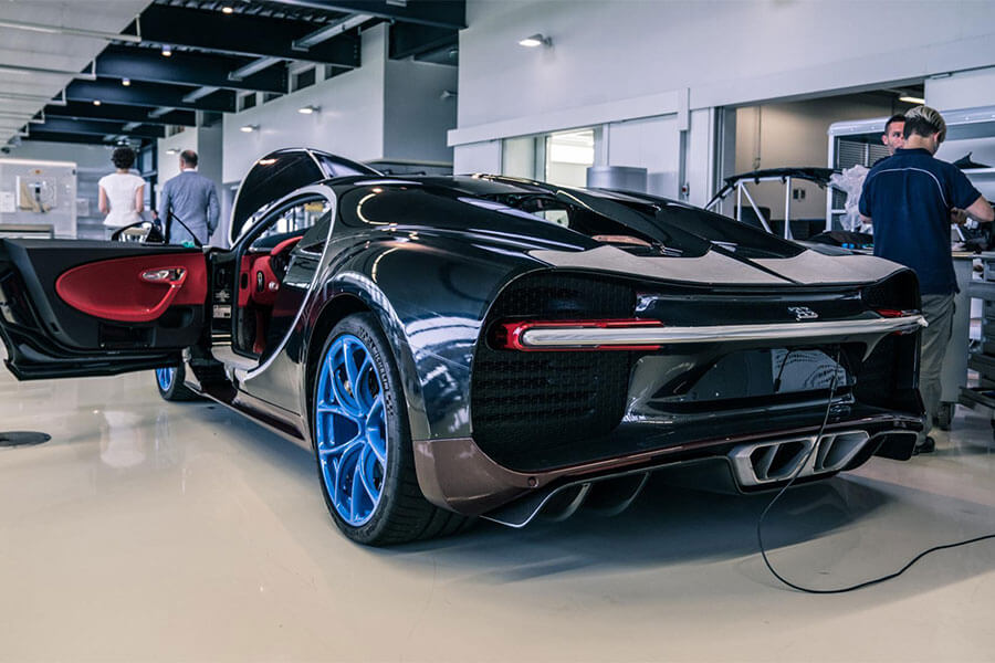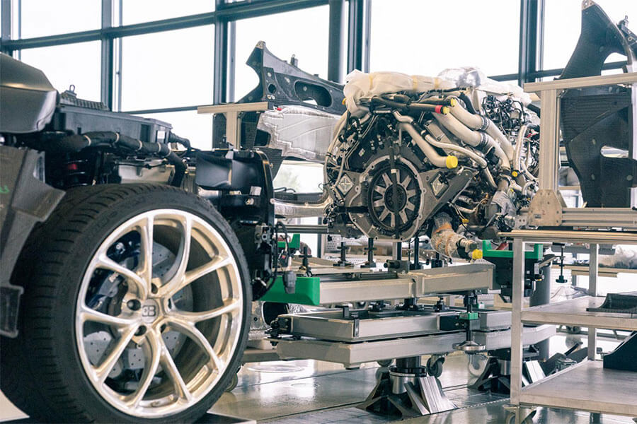 Atelier的建築外形參照了Bugatti人所共知的macaron楕圓形商標,內部設施包括了三個車架組裝區和一座滾動式測試平台。後者最近才完成更新,因為Chiron第一次火力全開接受測試便毀掉原有設施的電子系統,導致生產中心所在的阿爾薩斯區局部停電。整個Atelier設施瀰漫著寧靜出塵的氣氛,卻無惺惺作態的感覺,氣勢介乎Bowling du Trefle保齡球中心與Dorlisheim麥當勞之間,途經此地的大部分人甚至渾然不知樓內正在發生多麼奇妙的事。