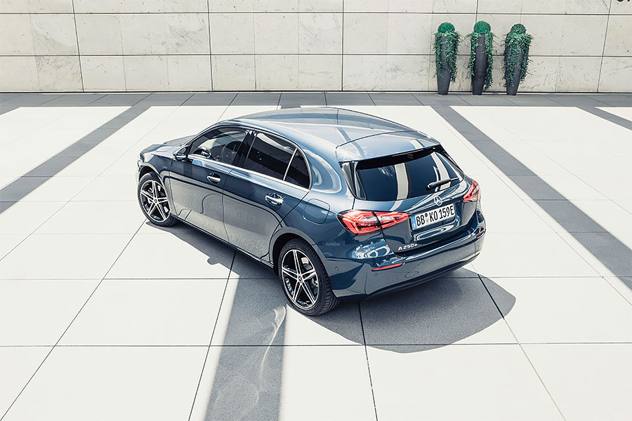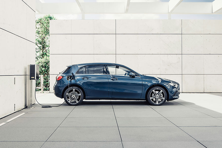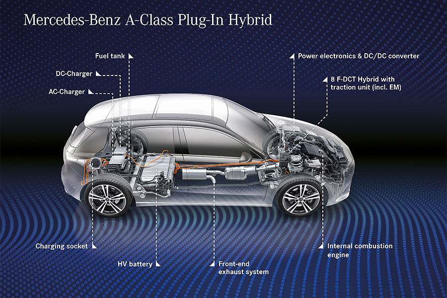 如同賓士其他已用上EQ Boost技術的車款,A 250 e同樣以整合在引擎上的皮帶式啟動馬達取代了舊有款式,以利將低震動與噪音,並創造更高的效率輸出及舒適性。後排座椅下方15.6kWh電容量的鋰電池組,滿電狀態下可為車輛貢獻40公里純電續航力。以DC直流電充電,25分鐘即可獲得80%電量;若改用AC交流電Wallbox的話,完成100%蓄電則需1小時45分鐘。