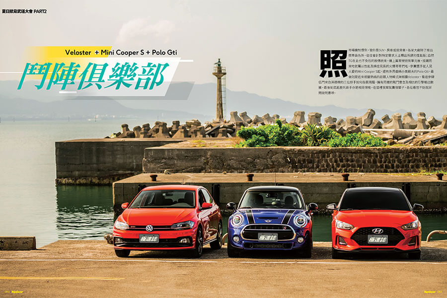 照市場機制慣例,管你是SUV、房車或掀背車,各家大廠除了推出標準貨色外,往往會針對特定需求人士釋出所謂的性能版;自然TG在此也不免俗的按傳統來,繼上篇常規掀背單元後,接踵而來地就屬以性能及操控見長的火爆哥哥們啦,參賽選手從人見人愛的Mini Cooper S起,還有外界戲稱小高爾夫的Polo GTI,最後則是近來相當熱絡的話題人物韓式辣椒醬Veloster,看這參肆伍門來自英德韓的三位好手如何各展風騷,擁有同樣的戰鬥意念及相仿的引擎輸出數據,最後到底能鹿死誰手亦是相見恨晚,在這裡我輩就賣個關子,各位看倌不妨就詳閱說明書唄~