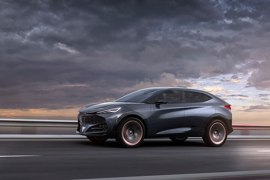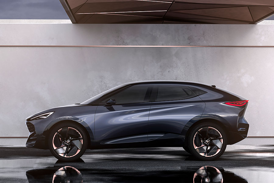 4門SUV Coupe的側身輪廓顯示Cupra品牌的性能特質,無窗框的玻璃幾乎與前擋形成一個270度的環型觀景窗。加上腰際一道斜上的立體折線、隱藏式車門把手,以及側裙上的空力套件設計,又有誰還會記得這輛車也是來自VAG集團呢?輪拱下的22吋輪圈,不只有帥氣的造型,實際上更能有效降低這輛電動休旅車行進時的風阻係數。