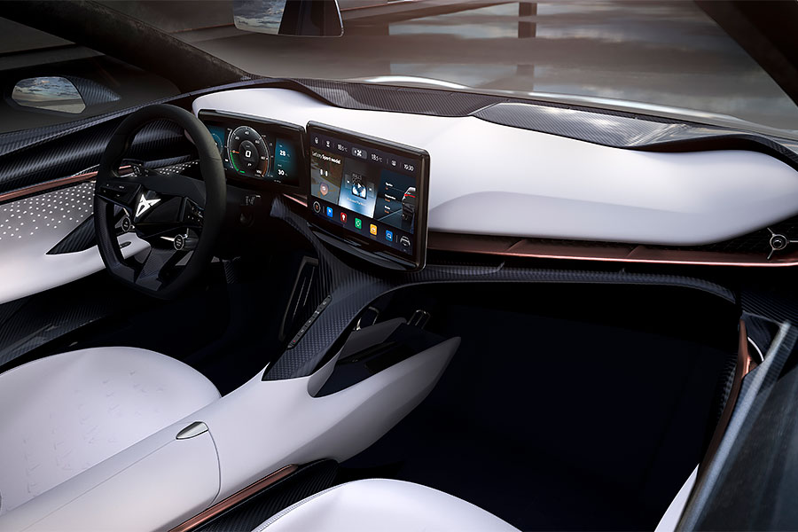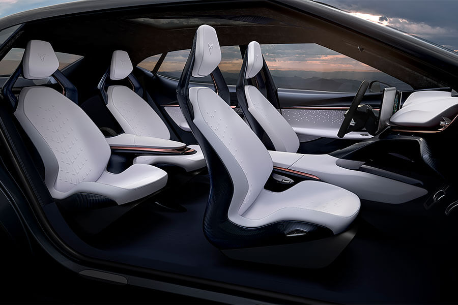 已經十分具有量產規模的Cupra Tavascan,車內可見許多真皮、Alcantara麂皮與碳纖維飾板添加性能味。在這講求數位娛樂的時代,白色跑車座椅不僅得提供乘坐舒適性,同時還整合有音響系統與智慧型手機連接功能滿足現代人需求。駕駛座前方,原廠配有12.3吋全數位儀錶組,中控檯上的13吋橫向觸控螢幕亦可轉向副駕駛座。另外藉由飛掠式的儀表板設計,亦使得前座空間更顯寬敞。