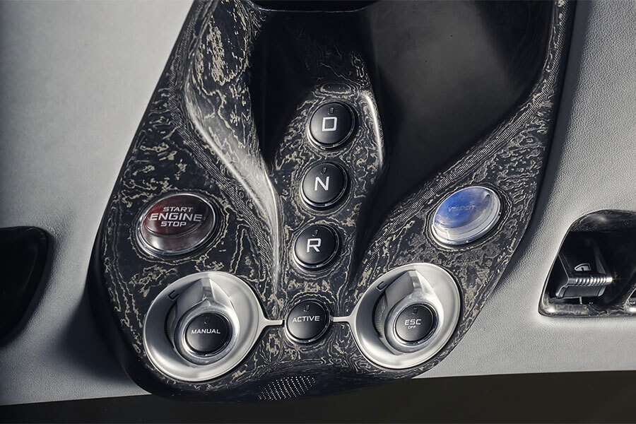 中置駕駛席予人天上天下唯我獨尊的感覺,化繁為簡的車廂設計則進一步彰顯左右視野對稱的開揚感。你不會找到傳統遮陽板,因為Speedtail使用了電動變色玻璃,用一枚按鈕就可以調節透光度,就連LED室內照明也跟玻璃窗融為一體。減少了映入眼簾的雜物,偌大擋風玻璃和通風口構成的對稱畫面自然而然會把你的視線誘導至那個手工精美勝似木雕的碳纖維方向盤上。這種由原塊碳材薄削而成的纖維,每層編織厚度不外乎30微米,摸起來質感非同凡響,應用範圍更涵蓋換檔撥片和頭上舷窗外圍的儀錶筒。後者集合了多項控制功能,包括換檔按鈕、開關引擎和動態模式選擇,當中又Velocity按鈕最耐人尋味。