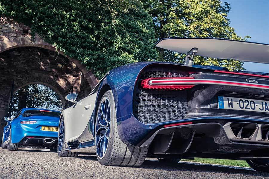 於是乎在這個陽光明媚的秋天早上,我發覺自己站在Chateau Saint-Jean門前凝望著一部藍白雙色的碳纖維Chiron,Chiron後面則停泊著一部Alpine A110。拍攝期間,Bugatti CEO Stephan Winkelmann來到現場,面上露出一副好奇表情。「不會是當真比較吧?」他所言的確有理。