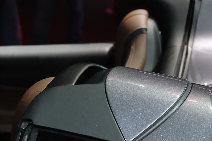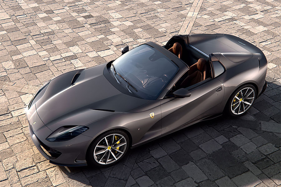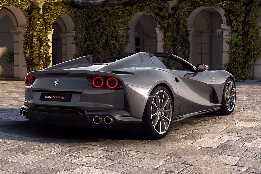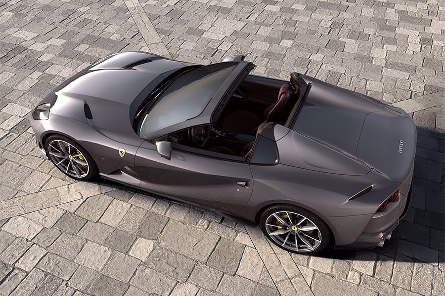 為了讓812 GTS頂篷閉合時能保有媲美812 Superfast的性能,而開篷時又能讓乘客享有最佳的乘坐舒適性。設計團隊於是在空氣力學層面下足功夫,首先他們並未延用超級快的分流後輪拱設計,反而改在增加了後下分流器的結構,以利下壓力與動態穩定度的提升。接著,團隊將注意力轉向車尾優化,使其能兼顧可收折式的硬頂與閉合後的行李收納空間。而尾翼頂部的通風口則有助於降低行進時的風阻。透過擋風玻璃旁與LeFerrari Aperta相同的2個L型小襟翼則將,氣流得以集中並導向駕駛艙後方,以避免乘客頭部後方的壓力過大。最後,座椅上方的拱狀結構內部也規劃有空氣力學通道,可將迎面風導向後方的頂篷罩區域,釋放車內壓力。