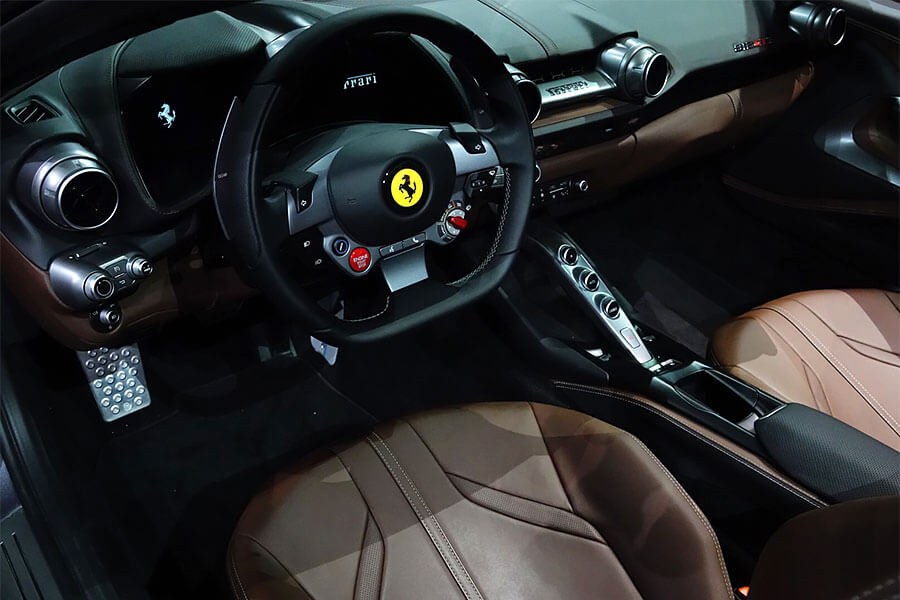 同稍早發表的Ferrari F8 Spider,812 GTS車艙採取相同雙座設計,並以深色系的黑棕雙色皮革搭配鋁合金飾板構成主視覺。駕駛座前方配有最新世代的方向盤,右下方同樣有著可用以激發引擎潛力的紅色Manettino旋鈕,前方亦可見到中置的轉速錶設計。副手座前方與F8 Spider相同,法拉利原廠也提供選配7吋觸控螢幕。